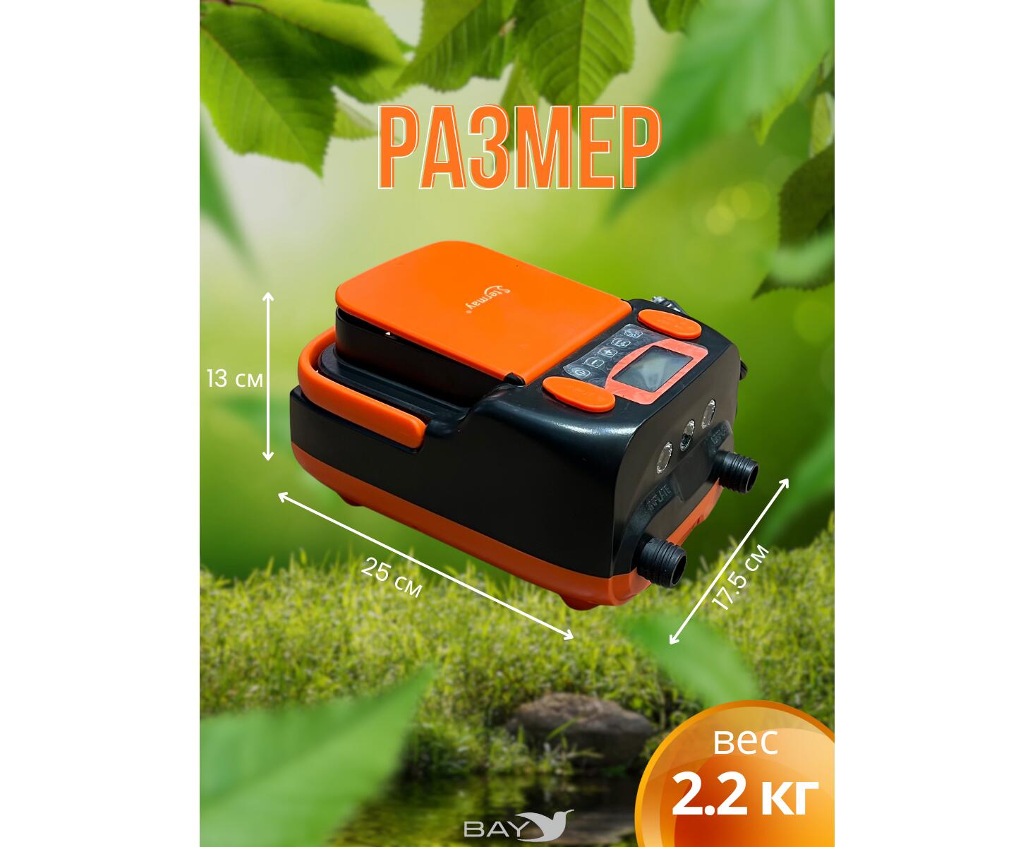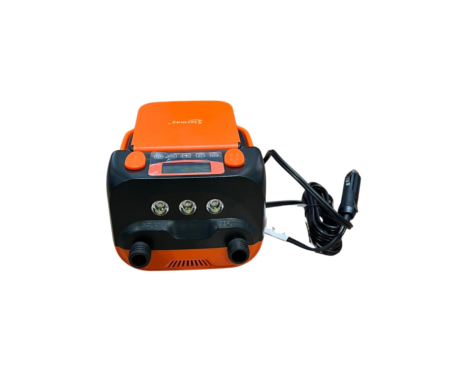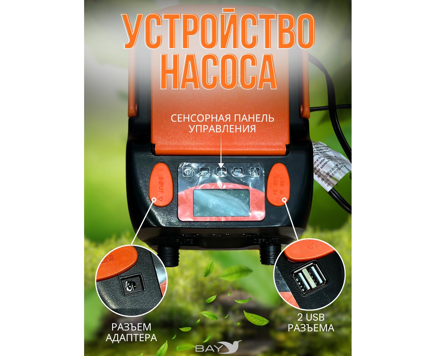 Насос работает в двух режимах: быстрое надувание на первом этапе и точное доведение до нужного давления на втором. Встроенные светодиоды с двумя режимами освещения упрощают использование в темноте. Удобная складная ручка и отсек для шнура делают транспортировку и хранение комфортными. В комплекте также предусмотрена сумка для переноски.
