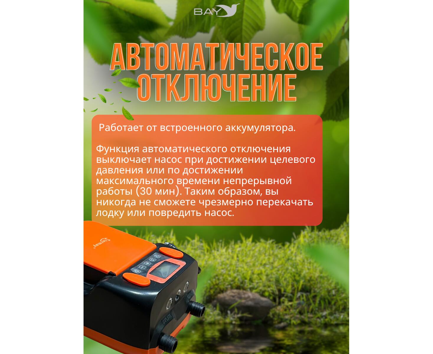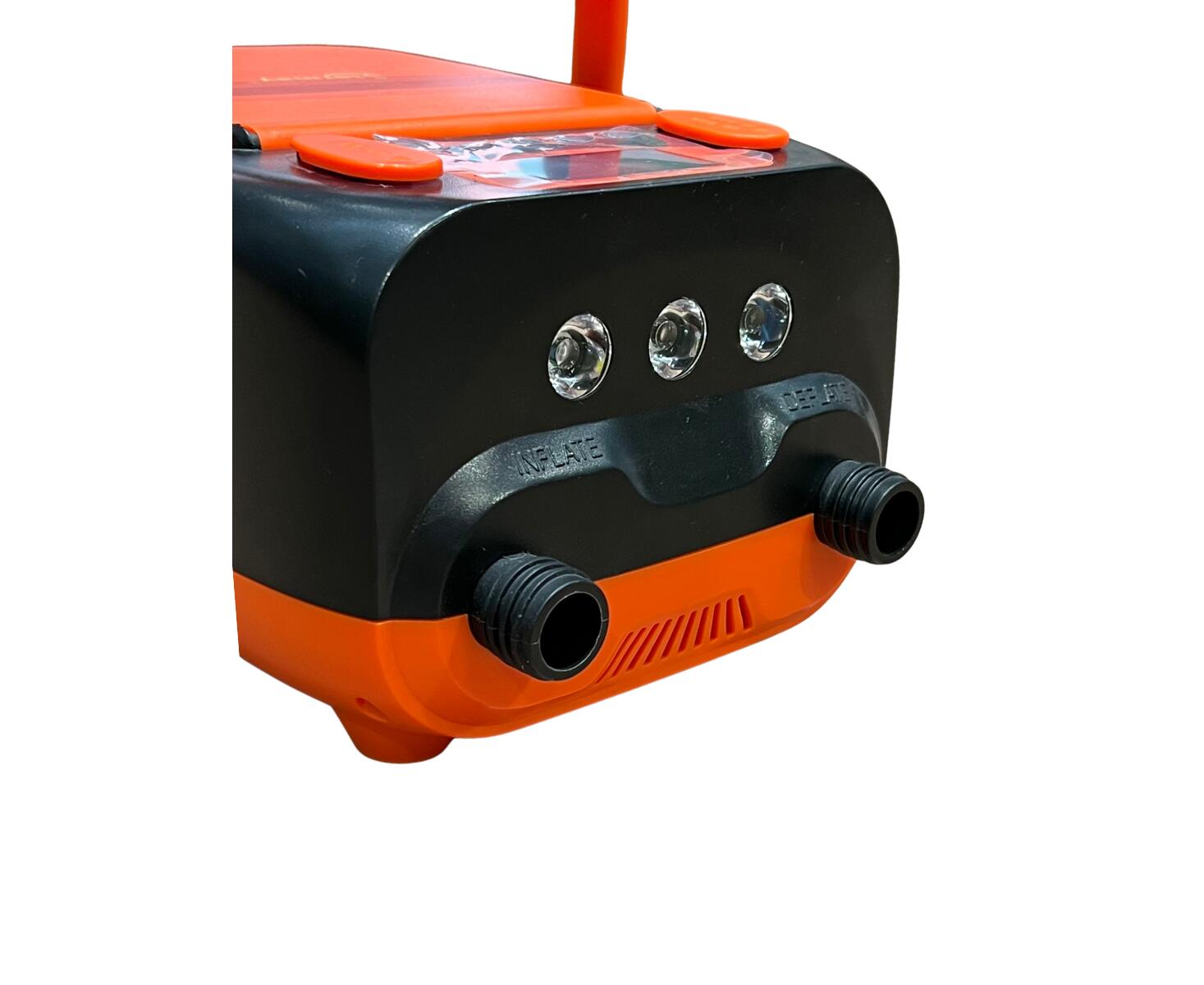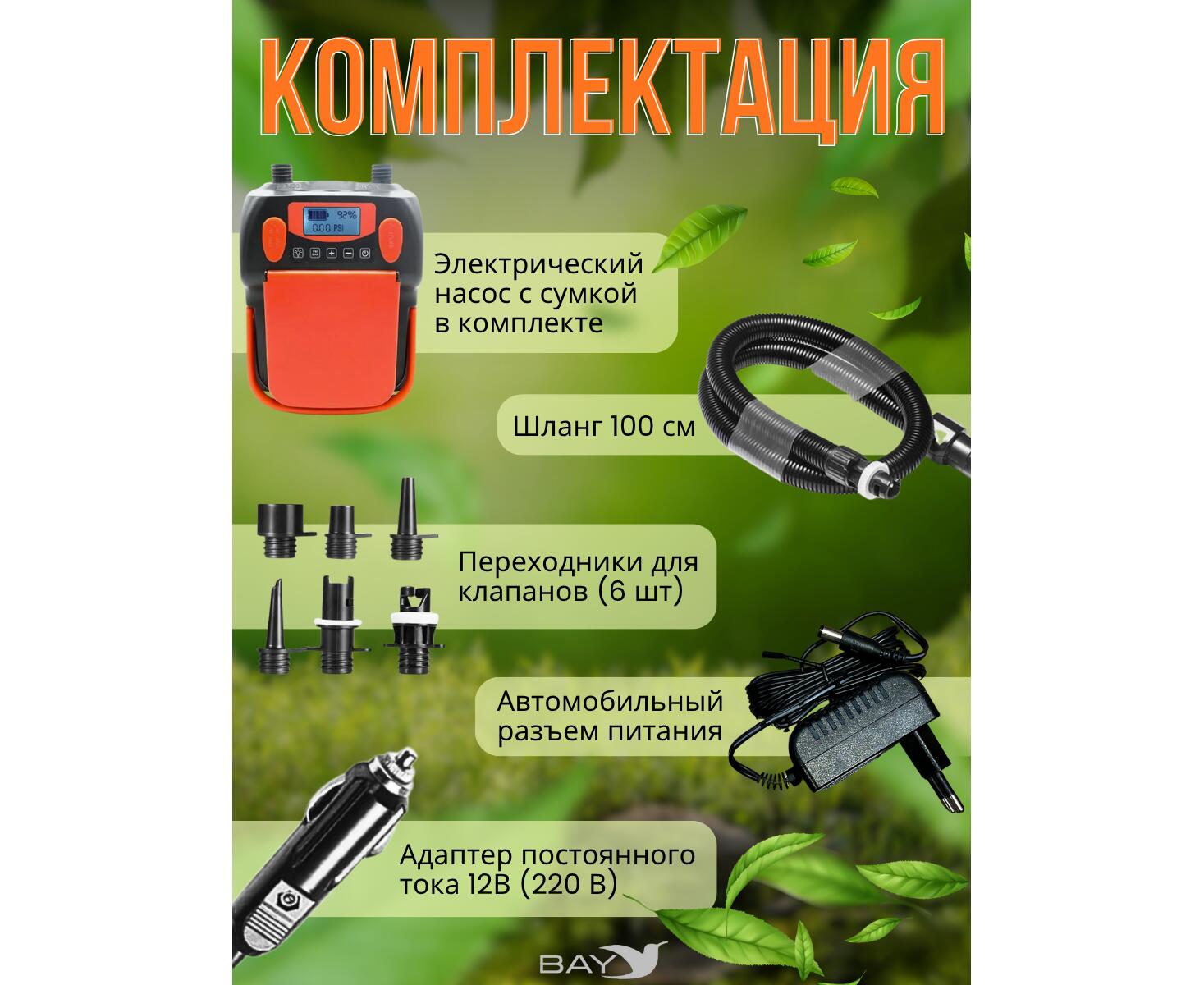 Насос работает в двух режимах: быстрое надувание на первом этапе и точное доведение до нужного давления на втором. Встроенные светодиоды с двумя режимами освещения упрощают использование в темноте. Удобная складная ручка и отсек для шнура делают транспортировку и хранение комфортными. В комплекте также предусмотрена сумка для переноски.
