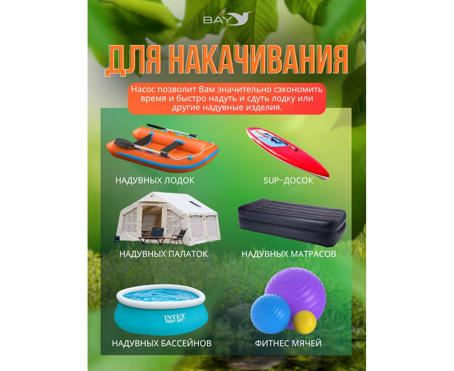 Устройство подходит для надувания и сдувания различных изделий, таких как матрасы, лодки, палатки и сапборды. В комплекте идут 6 насадок для большинства надувных изделий. Встроенный аккумулятор емкостью 6000 мАч обеспечивает автономную работу, а два USB-порта (1А/2А) позволяют заряжать гаджеты. Заряжать насос можно от сети 220В или через автомобильный прикуриватель 12В.