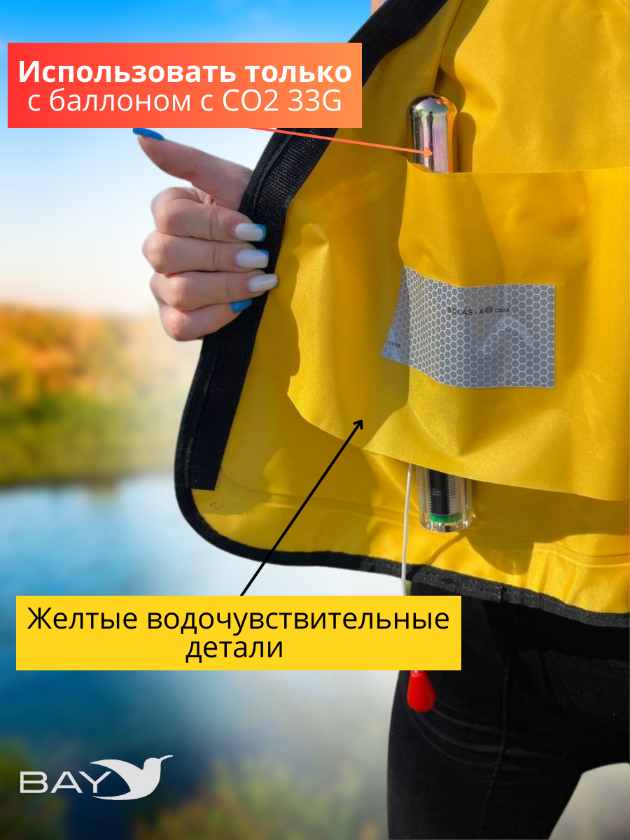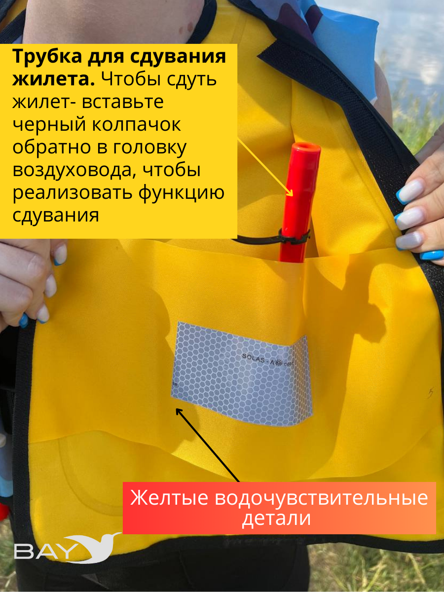 Надувная камера ярко-желтого цвета имеет удобную форму для удержания головы человека лицом вверх. Оснащен аварийным свистком, страховочным поясом и светоотражающими нашивками. Для аварийного надувания жилета предусмотрена трубка для надувания ртом.