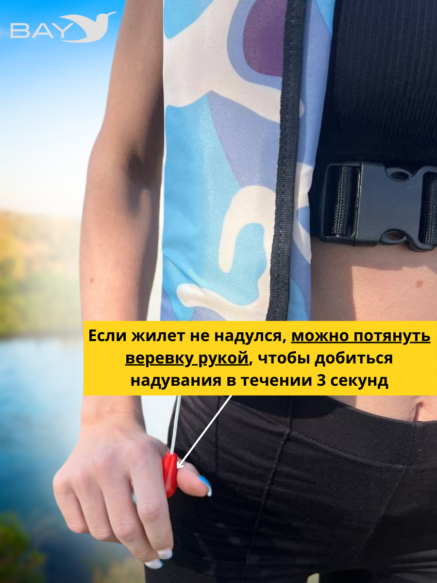 Наличие паховой стропы создает надежную фиксацию при погружении в воду. При попадании в воду жилет автоматически наполняется воздухом за 5 секунд. Если он не надулся, вы можете потянуть веревку рукой с правой стороны, чтобы добиться надувания в течении 3 секунд. С правой стороны есть красная трубка. Вы можете снять черную крышку с нее, чтобы поддуть воздух в жилет.