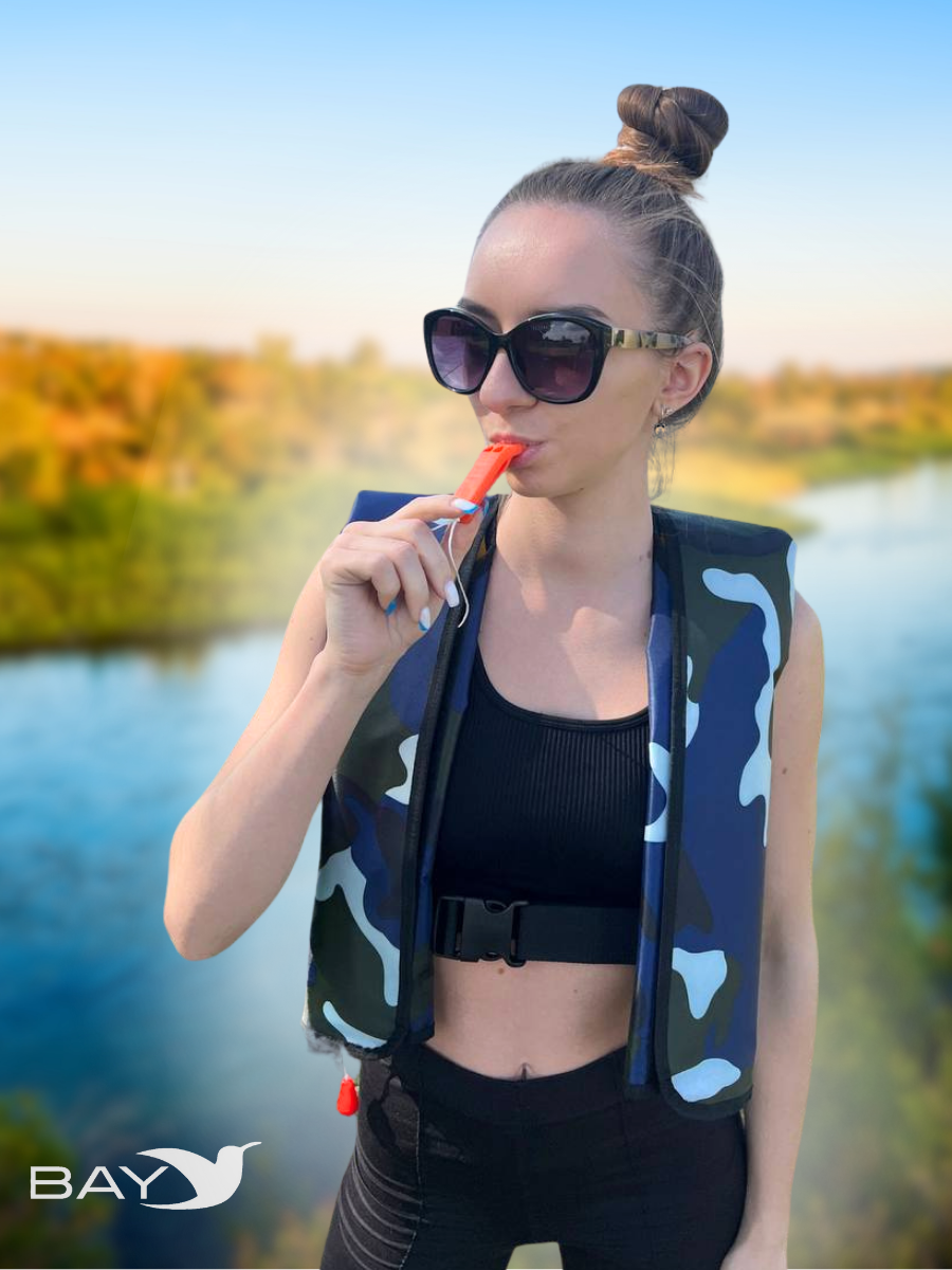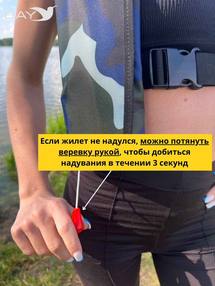 Наличие паховой стропы создает надежную фиксацию при погружении в воду. При попадании в воду жилет автоматически наполняется воздухом за 5 секунд. Если он не надулся, вы можете потянуть веревку рукой с правой стороны, чтобы добиться надувания в течении 3 секунд. С правой стороны есть красная трубка. Вы можете снять черную крышку с нее, чтобы поддуть воздух в жилет.