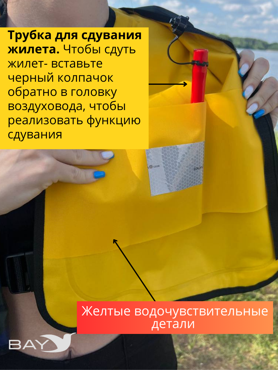 Надувная камера ярко-желтого цвета имеет удобную форму для удержания головы человека лицом вверх. Оснащен аварийным свистком, страховочным поясом и светоотражающими нашивками. Для аварийного надувания жилета предусмотрена трубка для надувания ртом.