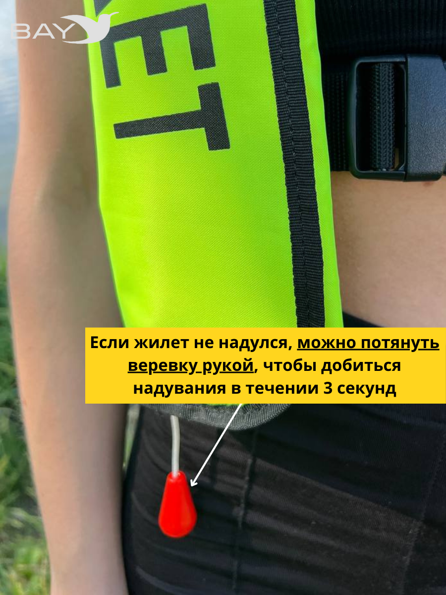 Наличие паховой стропы создает надежную фиксацию при погружении в воду. При попадании в воду жилет автоматически наполняется воздухом за 5 секунд. Если он не надулся, вы можете потянуть веревку рукой с правой стороны, чтобы добиться надувания в течении 3 секунд. С правой стороны есть красная трубка. Вы можете снять черную крышку с нее, чтобы поддуть воздух в жилет.