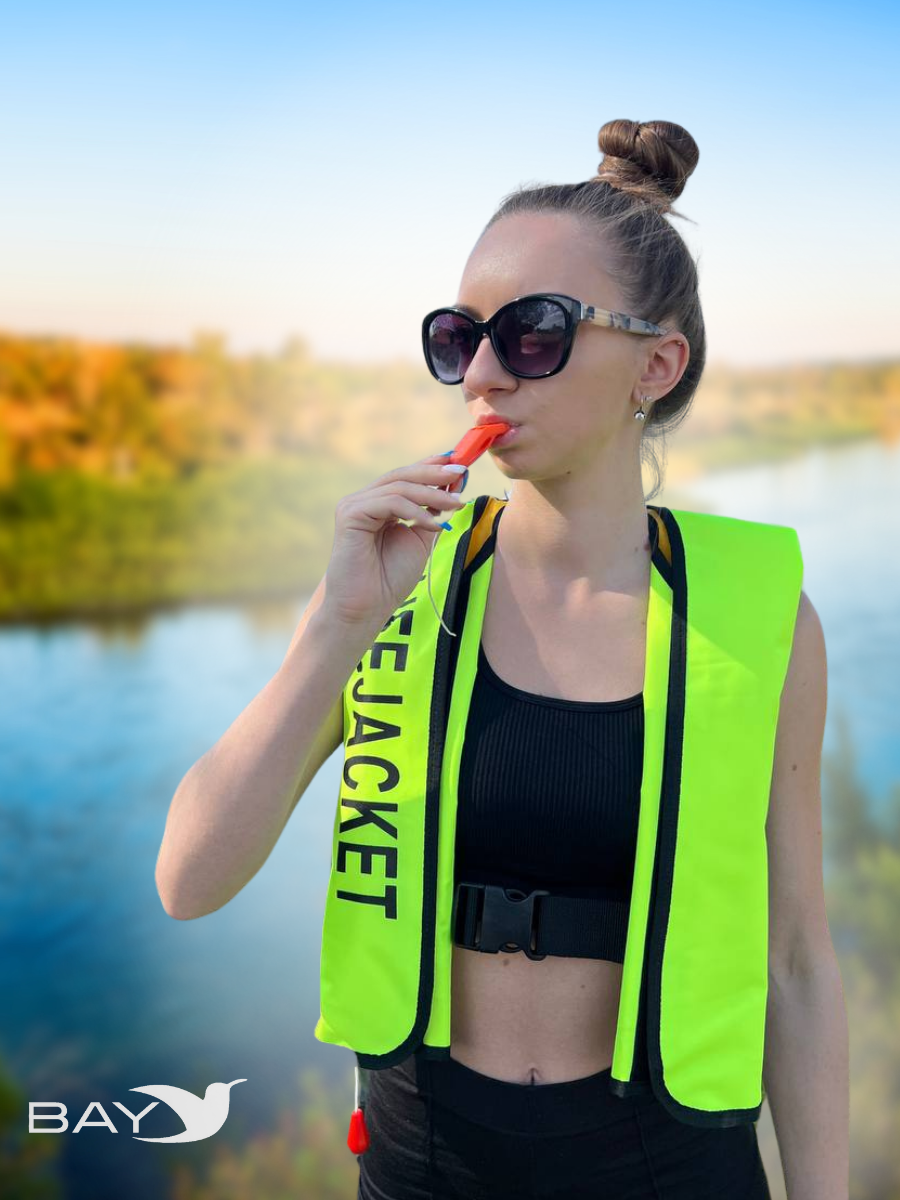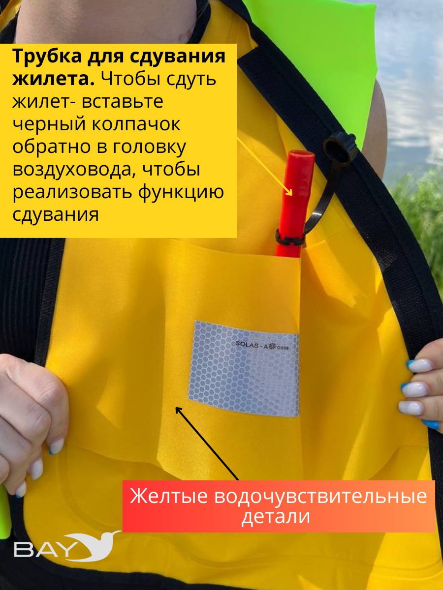 Надувная камера ярко-желтого цвета имеет удобную форму для удержания головы человека лицом вверх. Оснащен аварийным свистком, страховочным поясом и светоотражающими нашивками. Для аварийного надувания жилета предусмотрена трубка для надувания ртом.