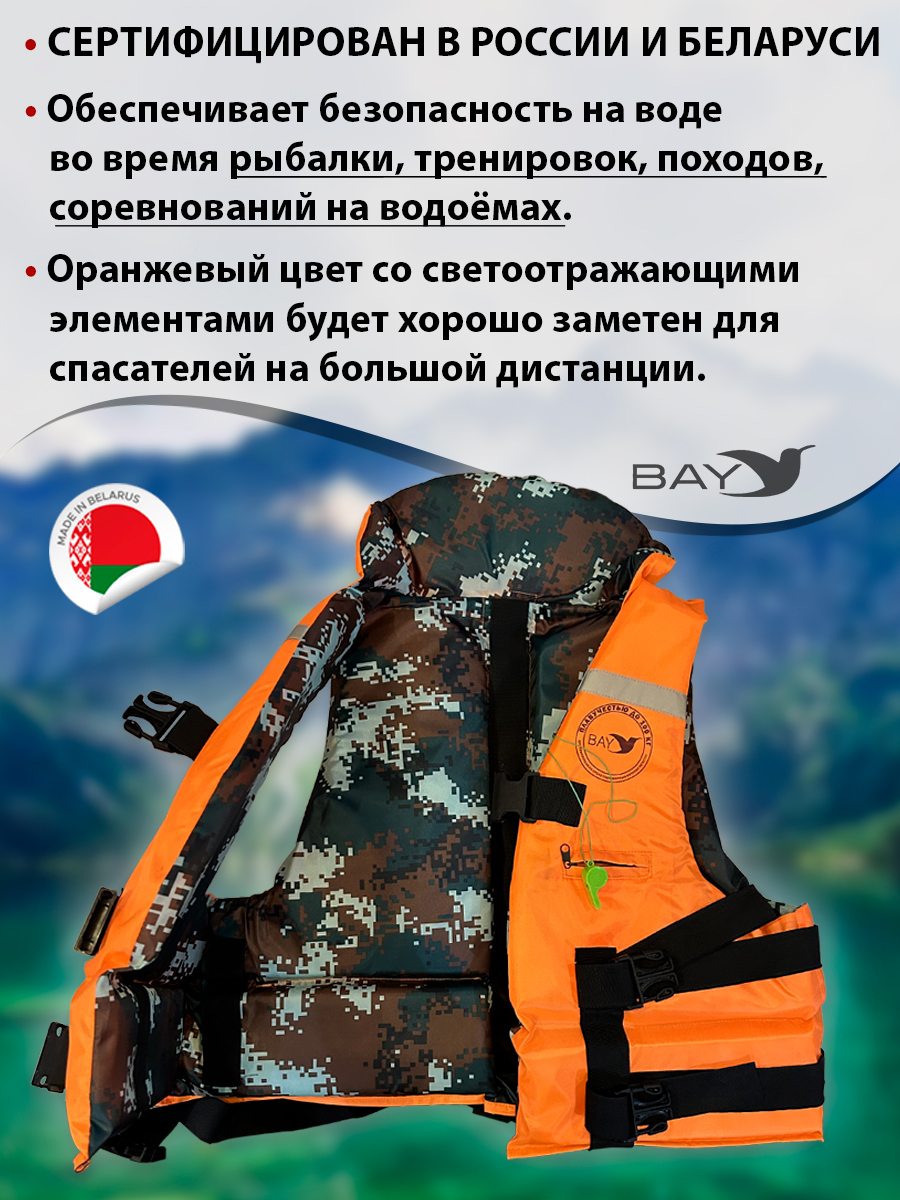 Спасательный жилет BAY предназначается для обеспечения безопасности на воде во время рыбалки, тренировок и соревнованиях в водных видах спорта, туристических водных походах.