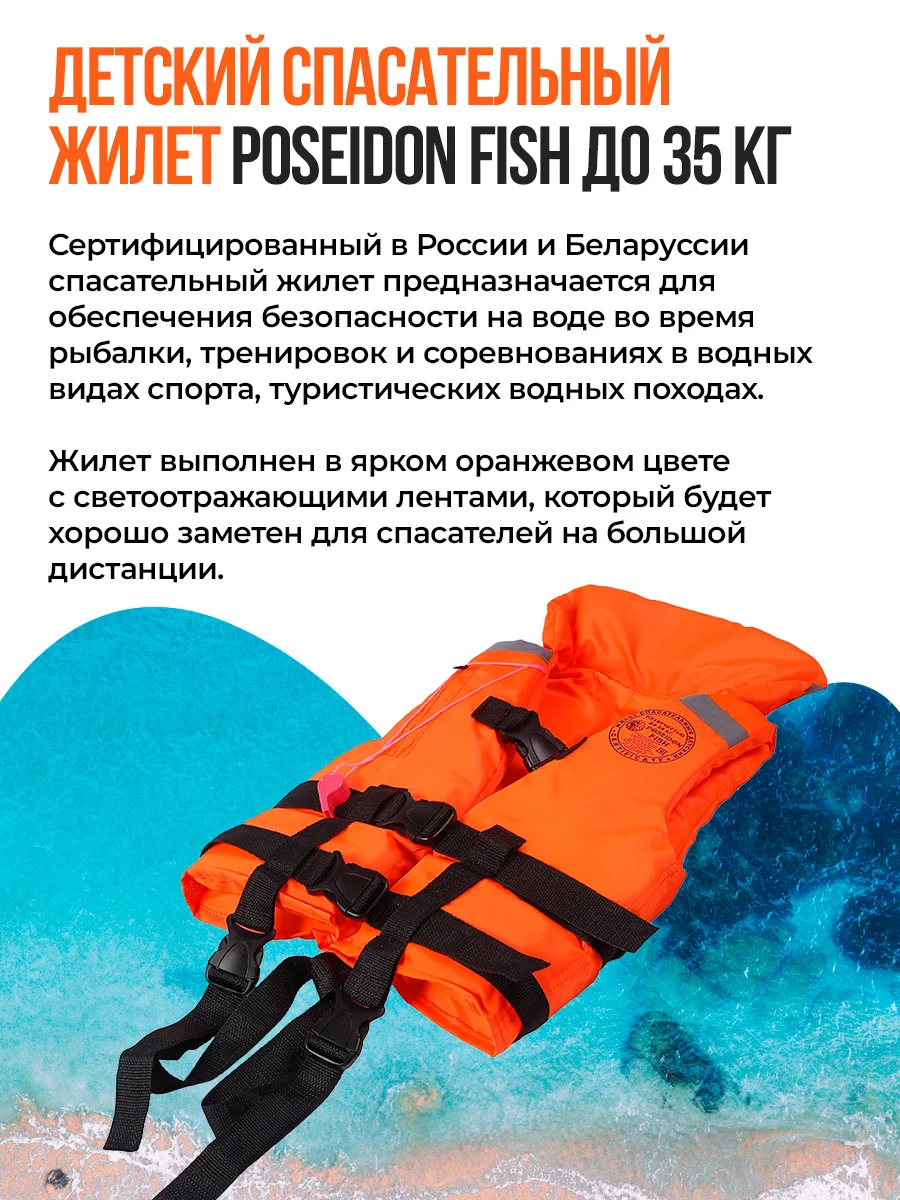 Спасательный жилет Poseidon Fish предназначается для обеспечения безопасности на воде во время рыбалки, тренировок и соревнованиях в водных видах спорта, туристических водных походах.