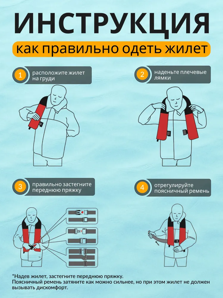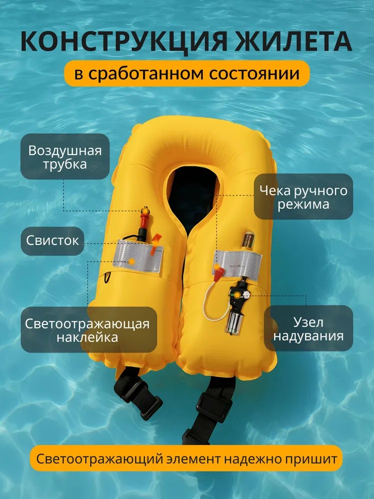 - Автоматическая и ручная активация – двойной механизм надувания для повышенной безопасности