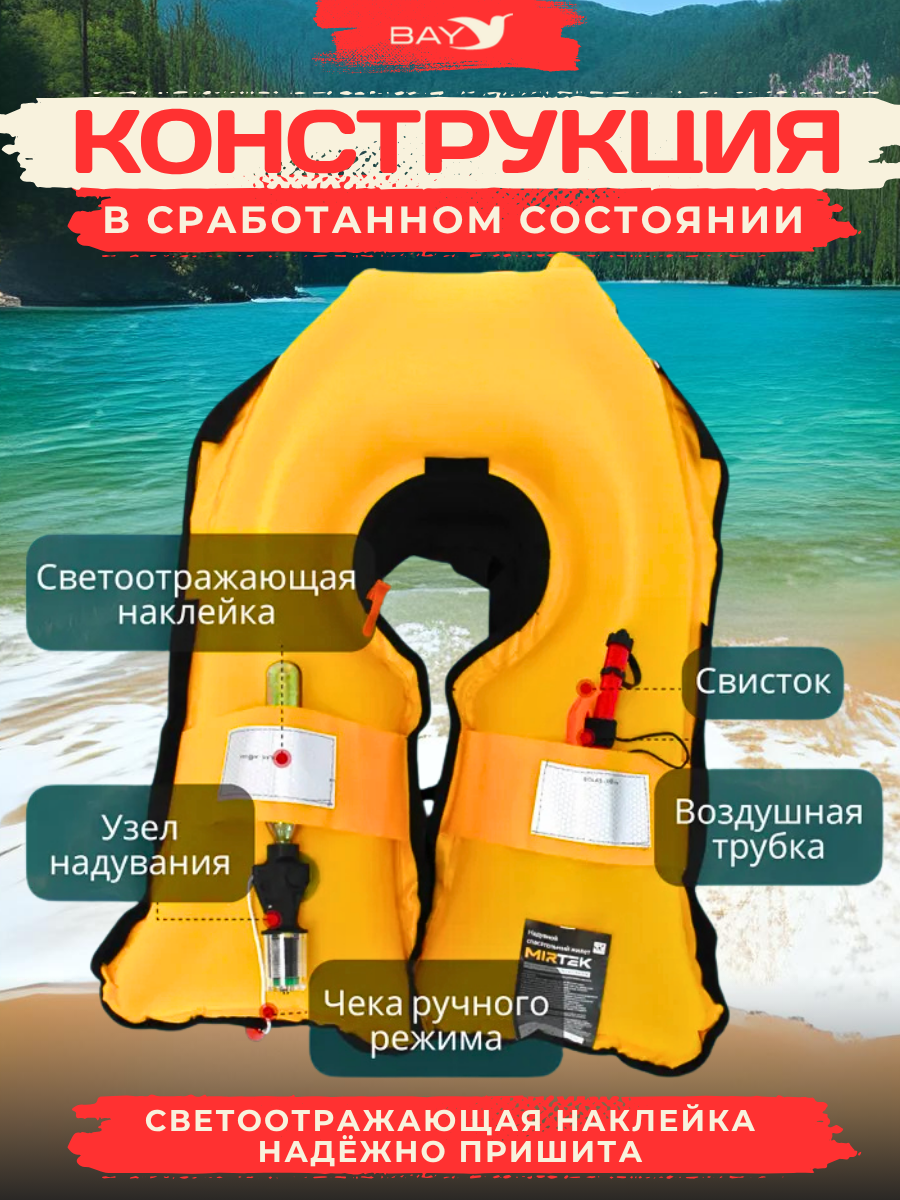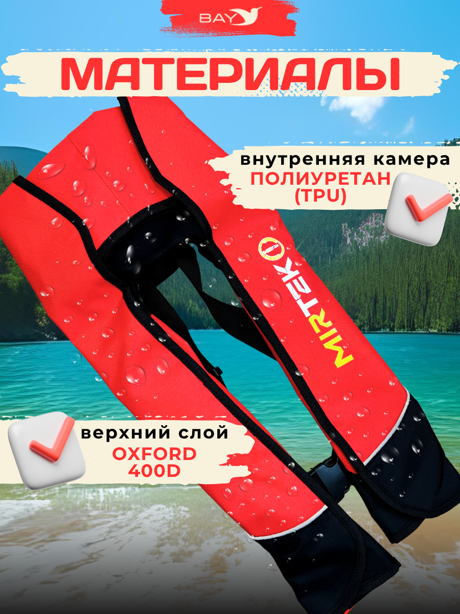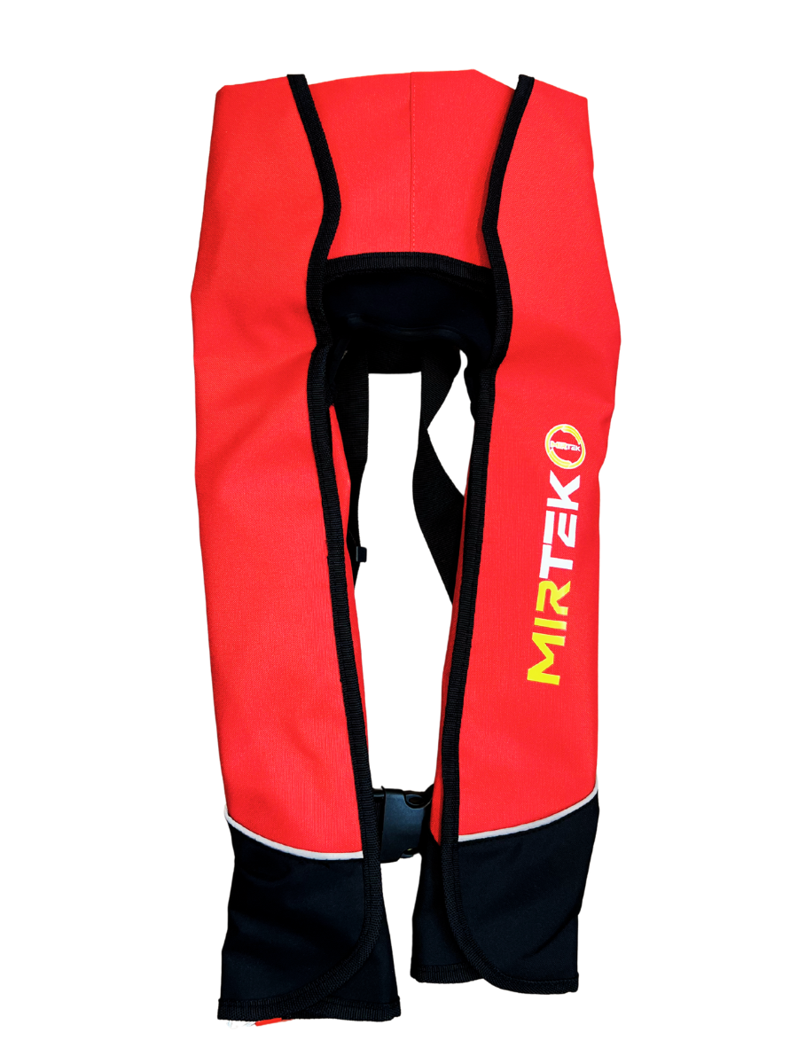 Надувной спасательный жилет Mirtek Lite сочетает легкость, удобство и высокий уровень безопасности. Подходит для взрослых пользователей весом до 130 кг, обеспечивая надежную поддержку на воде.