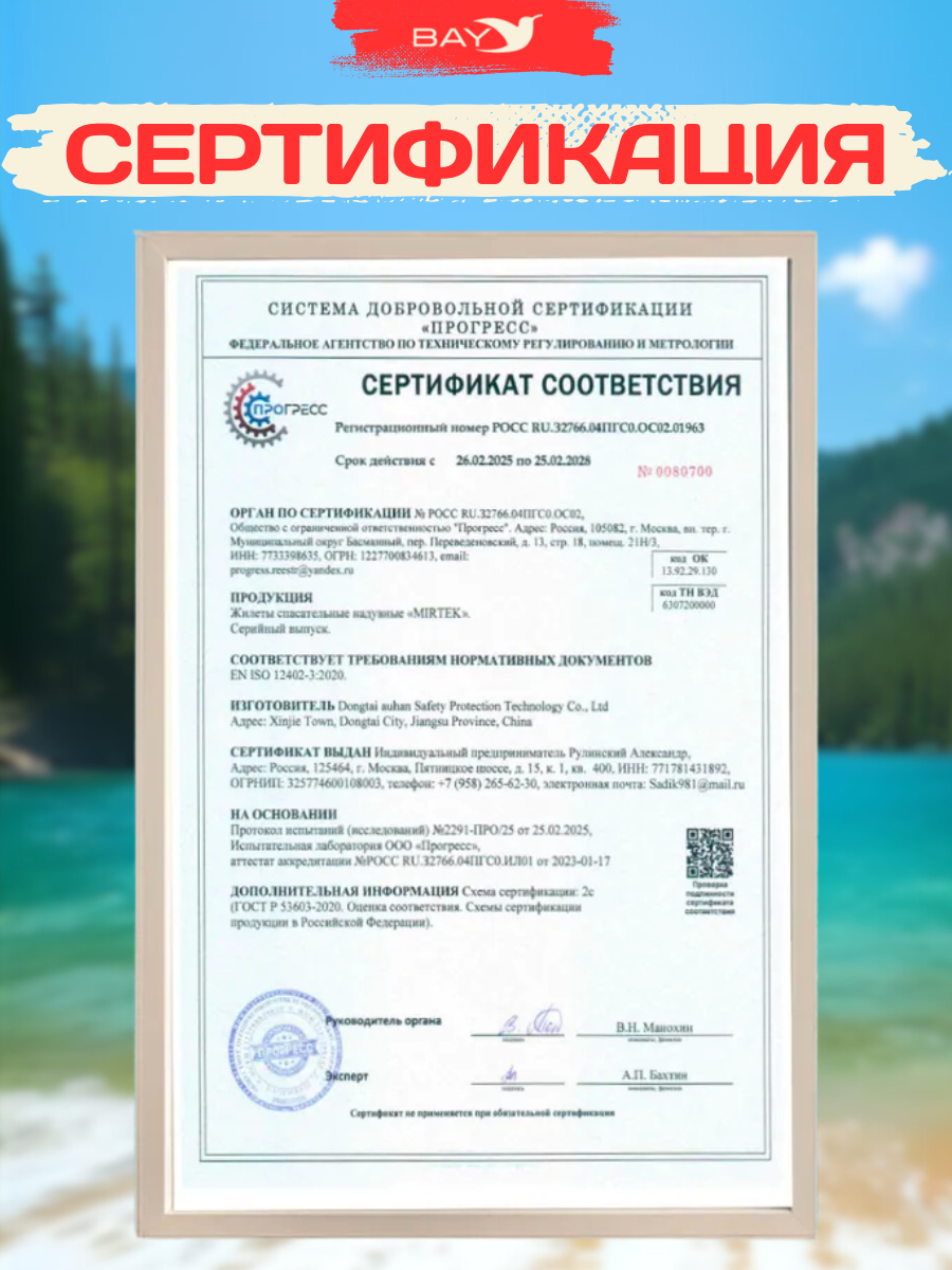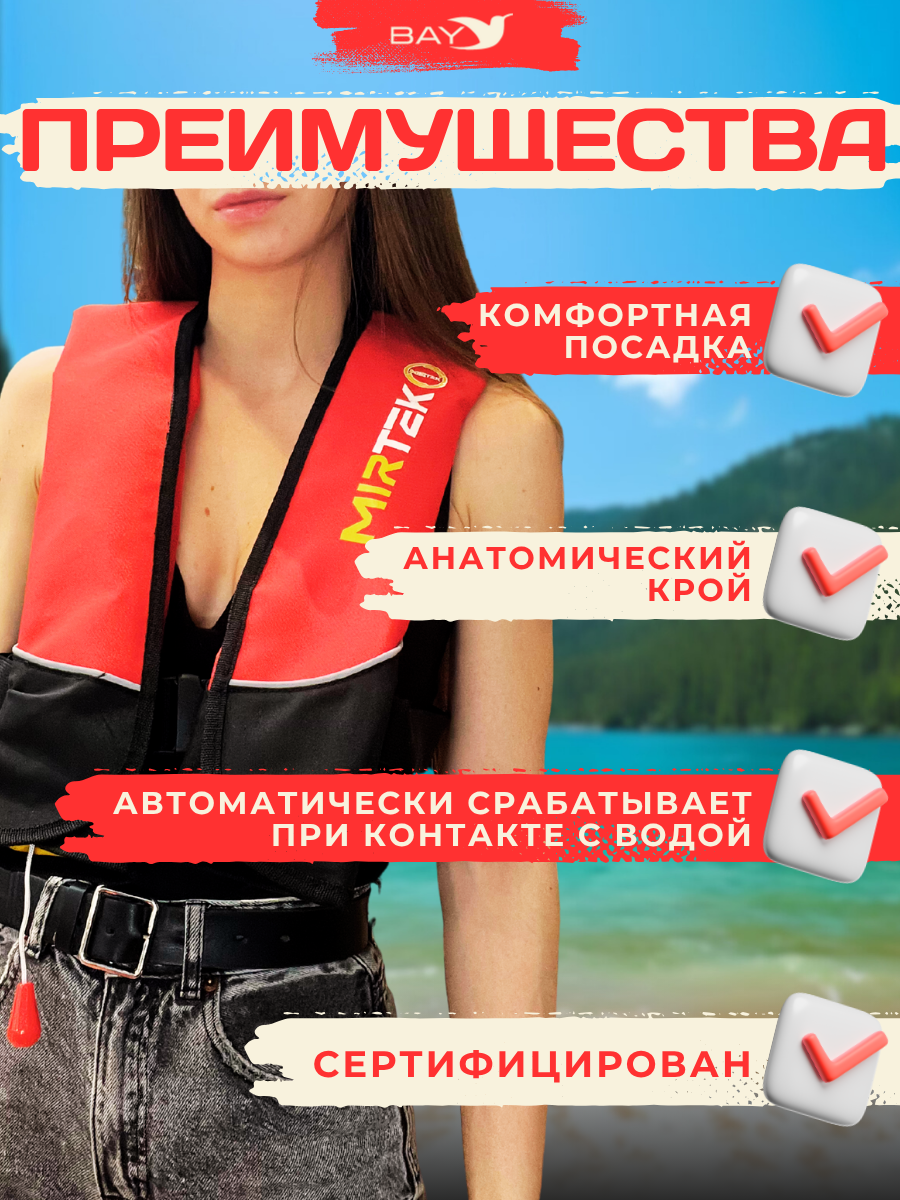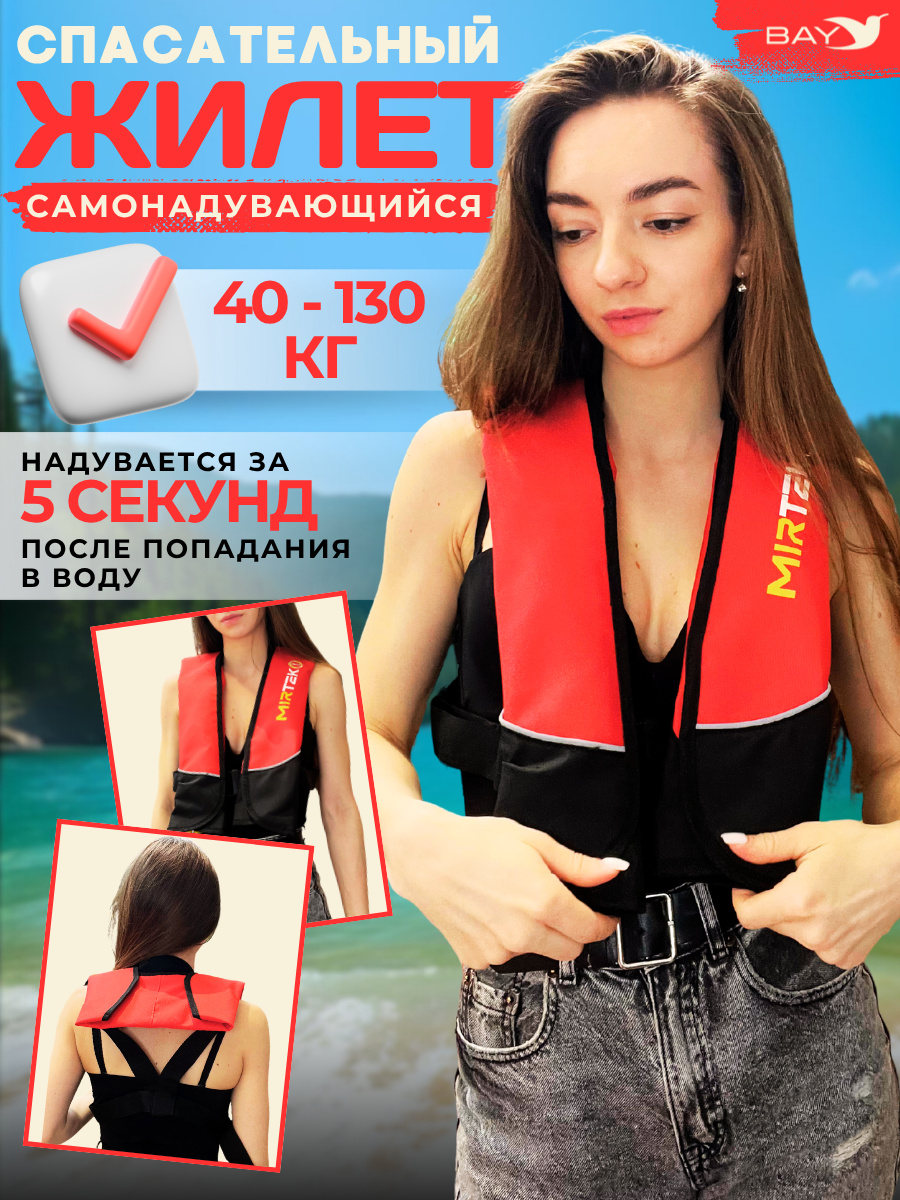 Надувной спасательный жилет Mirtek Lite сочетает легкость, удобство и высокий уровень безопасности. Подходит для взрослых пользователей весом до 130 кг, обеспечивая надежную поддержку на воде.