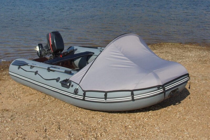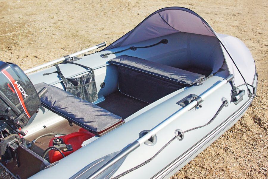Тент изготовлен из непромокаемого материала. Защищает пассажиров лодки от ветра и брызг.
