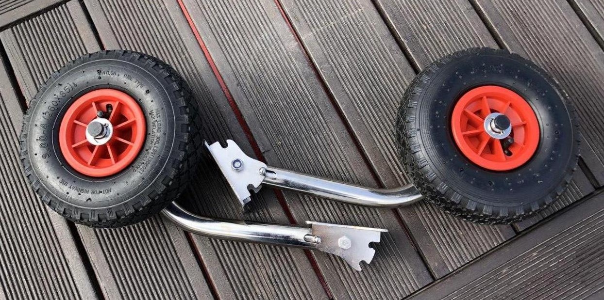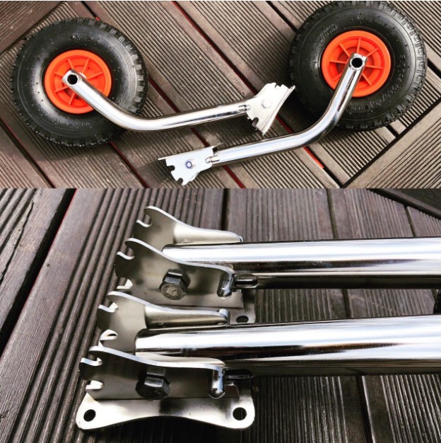 Транцевые колеса стандартные для пайольных лодок от 3,5 м. - это перекидные лодочные шасси, предназначенные для перевозки надувной лодки по суше, в т.ч. с установленным подвесным мотором, спуска на воду и вывода из воды на берег вручную одним человеком. Применение шасси на надувных лодках облегчает возможность подготовки лодки и эксплуатации в одиночку, обеспечивая владельцу независимость на рыбалке.