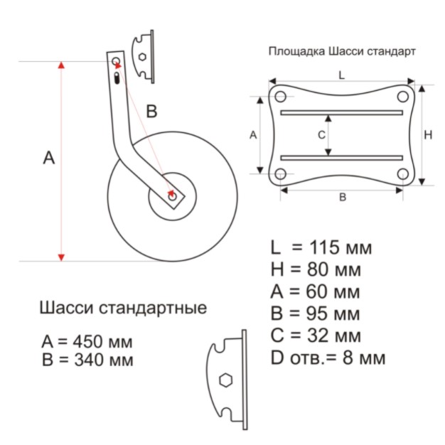 Данные лодочные шасси рекомендуются для лодок длиной от 3.50 метров, имеющих верхние брызговики-"косынки" (типа Касатка 385 и др.) Благодаря асимметричному расположению верхнего паза площадки стойка в нерабочем положении отводится немного назад и не мешает брызговикам.
