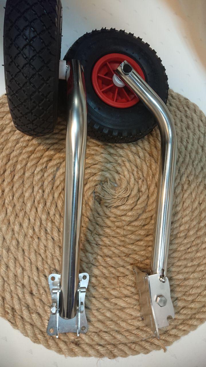 Транцевые шасси-колёса предназначены для облегчения спуска лодки на воду и вытаскивания её из воды. Выберите для вашей лодки подходящую модель с учетом особенностей днища лодки, её длины и материала. Все шасси снабжены камерными колесами с капроновой ступицей диаметром 260 мм. Отсутствие ржавеющего подшипника – большой плюс при постоянном контакте изделия с водой. Все шасси изготовлены из высококачественной полированной нержавеющей стали. Внутренняя пружина механизма – нержавеющая сталь AISI 316. Диаметр трубы стоек 32 мм, толщина стенки 2 мм. Толщина металла фланцев 3 мм.