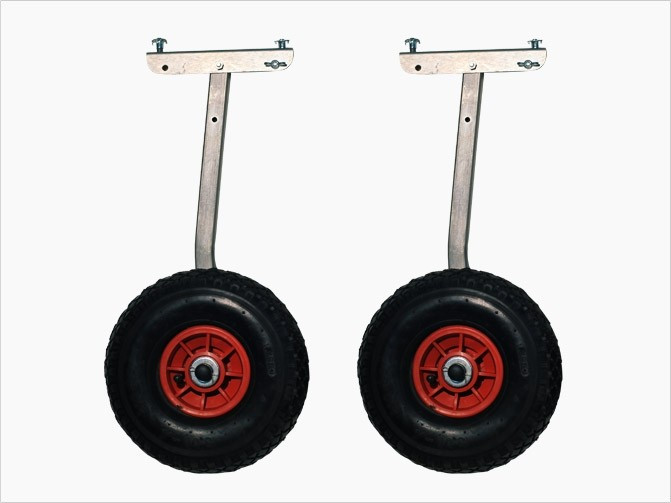 Транцевые колеса (комплект - 2 шт)Транцевые колеса от компании Аква-Штормпредназначены для лодок с жестким транцем. Они дают возможность самостоятельно и без особых усилий транспортировать полностью снаряженную лодку с мотором, спускать ее на воду или поднимать на сушу.Колёса легко устанавливаются и столь же легко снимаются с надувной лодки. Они хорошо едут по песчаным и каменистым поверхностям, а за счет того, что они откидные не мешают движению лодки в воде.Транцевые колеса изготавливаются из высококачественных, устойчивых к коррозии и износу материалов (черная сталь, анодированная цинком), и весят до 4,5 кг, выдерживая при этом нагрузку до 150 кг.