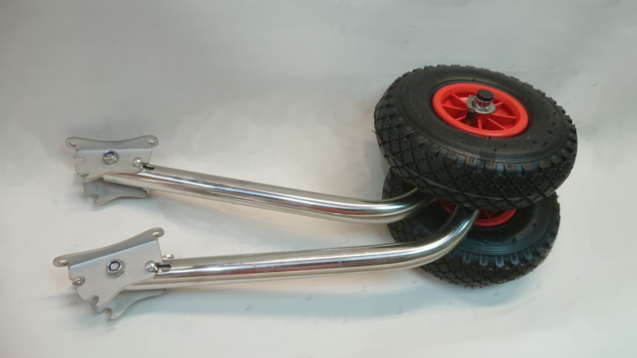 Транцевые шасси-колёса предназначены для облегчения спуска лодки на воду и вытаскивания её из воды. Выберите для вашей лодки подходящую модель с учетом особенностей днища лодки, её длины и материала. Все шасси снабжены камерными колесами с капроновой ступицей диаметром 260 мм. Отсутствие ржавеющего подшипника – большой плюс при постоянном контакте изделия с водой. Все шасси изготовлены из высококачественной полированной нержавеющей стали. Внутренняя пружина механизма – нержавеющая сталь AISI 316. Диаметр трубы стоек 32 мм, толщина стенки 2 мм. Толщина металла фланцев 3 мм.