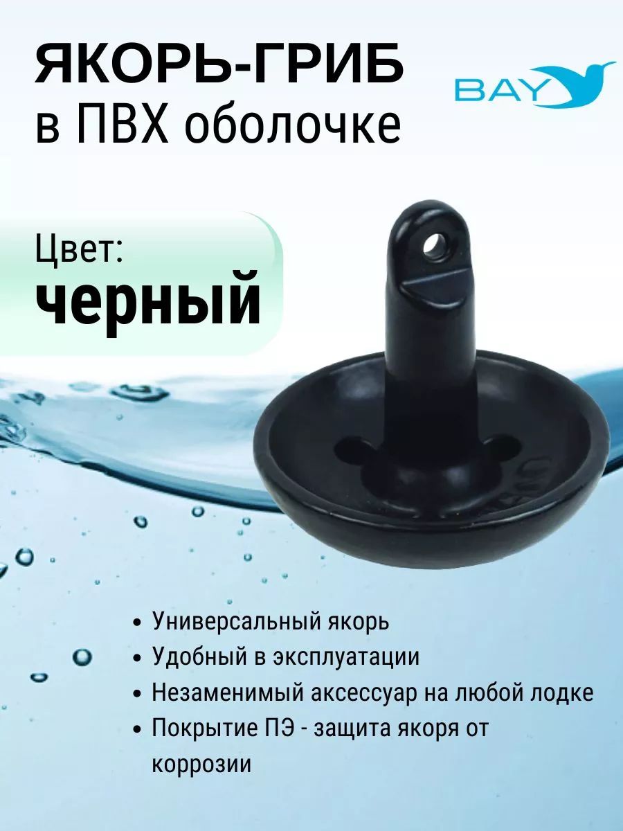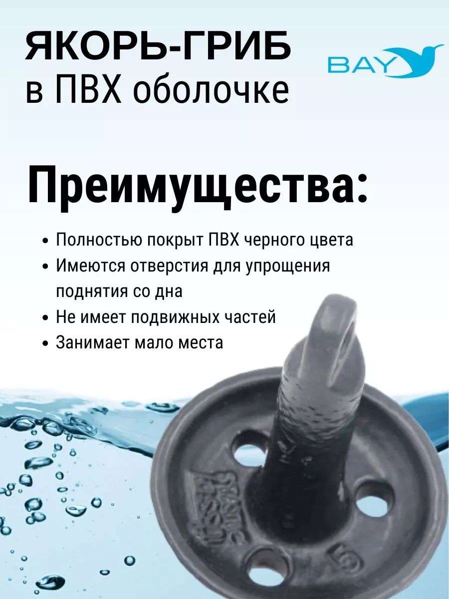 Якорь гриб 6,8 кг с покрытием ПЭ - это грибовидный якорь, изготовленный из стали и покрыт полиэтиленом (ПЭ) черного цвета, обладающий хорошей держащей силой. Занимает мало места и не имеет подвижных частей. Имеются отверстия для упрощения поднятия со дна. Покрытие ПЭ позволяет защитить грибовидный якорь от коррозии, а корпус лодки от возможных царапин. Также покрытие устойчиво к температурным колебаниям и механическим воздействиям. "Якорь для лодки ПВХ" - надежный спутник для вашего водного отдыха. Этот якорь специально разработан для использования с лодками из ПВХ, обеспечивая превосходное удержание и безопасность на воде. Изготовлен из высококачественных материалов, он обладает прочностью и долговечностью, не подвержен коррозии или деформации под воздействием воды и погодных условий. Специальный дизайн обеспечивает оптимальное сцепление с дном водоема, обеспечивая надежную фиксацию лодки в нужном месте. Якорь легок в использовании и обеспечивает легкость управления лодкой даже в условиях сильного ветра или течения. Незаменимый аксессуар для каждого владельца лодки ПВХ, гарантирующий комфорт и безопасность во время плавания.