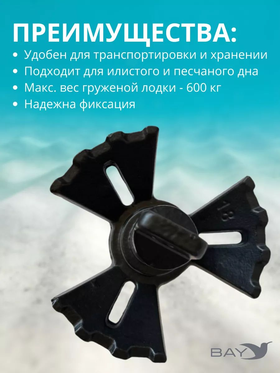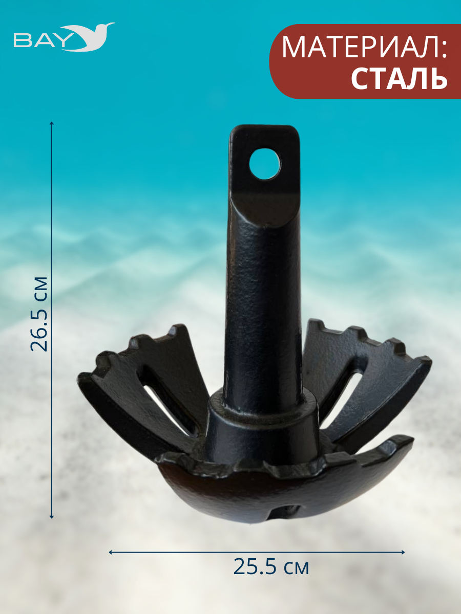 Якорь гриб зубчатый речной 8.16 кг с покрытием ПЭ - это грибовидный якорь, изготовленный из стали и покрыт полиэтиленом (ПЭ) черного цвета, обладающий хорошей держащей силой. Занимает мало места и не имеет подвижных частей. Имеются отверстия для упрощения поднятия со дна. Покрытие ПЭ позволяет защитить грибовидный якорь от коррозии, а корпус лодки от возможных царапин. Также покрытие устойчиво к температурным колебаниям и механическим воздействиям. "Якорь для лодки ПВХ" - надежный спутник для вашего водного отдыха. Этот якорь специально разработан для использования с лодками из ПВХ, обеспечивая превосходное удержание и безопасность на воде. Изготовлен из высококачественных материалов, он обладает прочностью и долговечностью, не подвержен коррозии или деформации под воздействием воды и погодных условий. Специальный дизайн обеспечивает оптимальное сцепление с дном водоема, обеспечивая надежную фиксацию лодки в нужном месте. Якорь легок в использовании и обеспечивает легкость управления лодкой даже в условиях сильного ветра или течения. Незаменимый аксессуар для каждого владельца лодки ПВХ, гарантирующий комфорт и безопасность во время плавания.