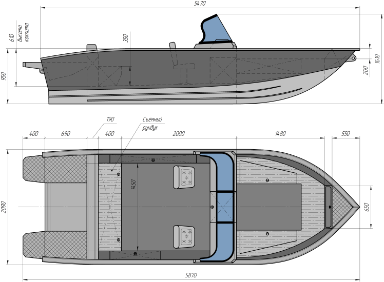 Открытая носовая палуба предоставляет дополнительное пространство для отдыха, размещения пассажиров и багажа. Такая компоновка делает лодку универсальной для прогулок и активного отдыха.