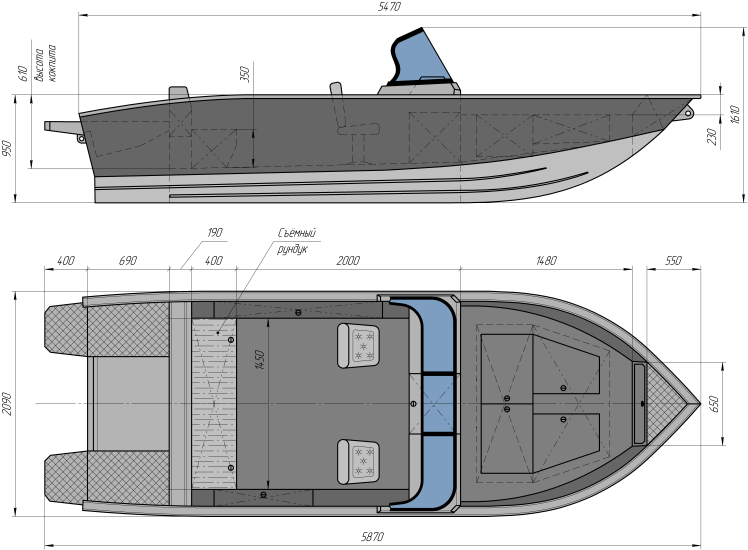 Корпус лодки выполнен из алюминиево-магниевого сплава с усиленными силовыми элементами. Такая конструкция обеспечивает долговечность, устойчивость к коррозии и механическим нагрузкам, а также высокую износостойкость при регулярной эксплуатации.