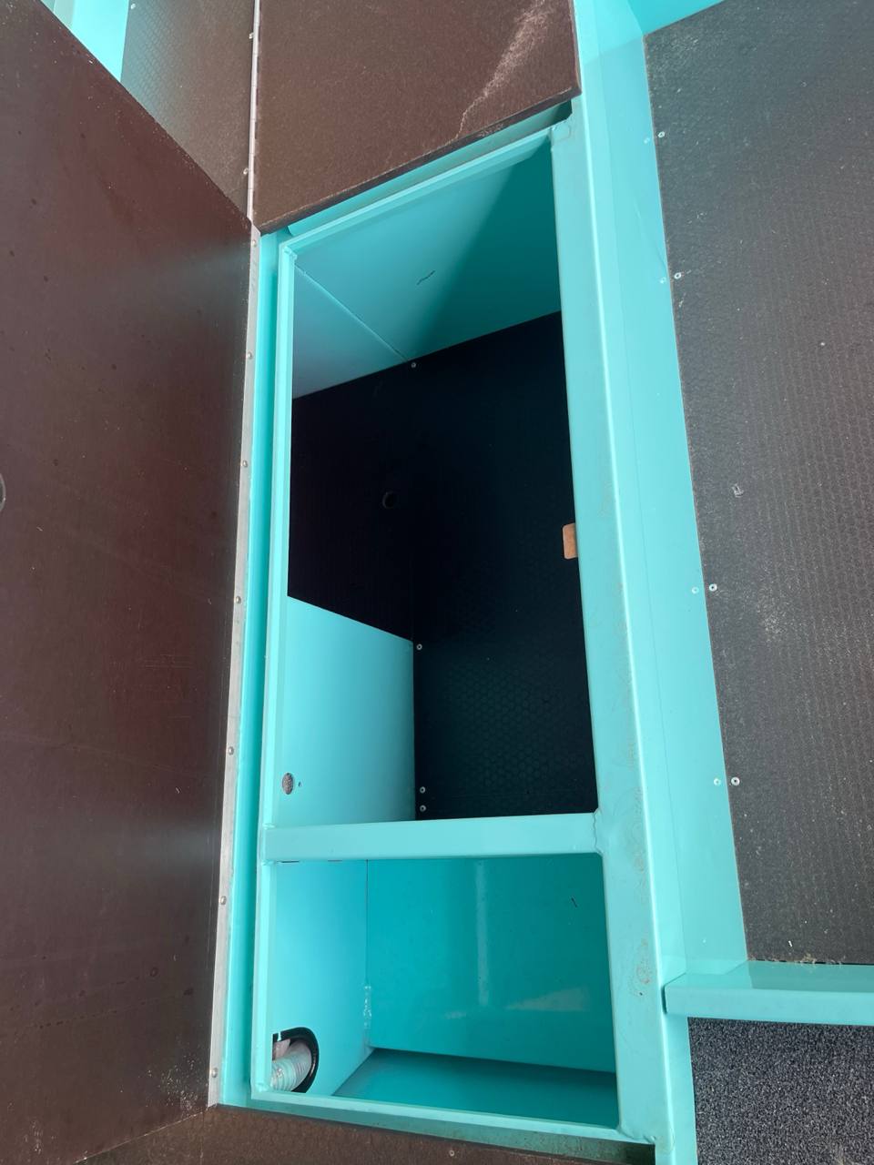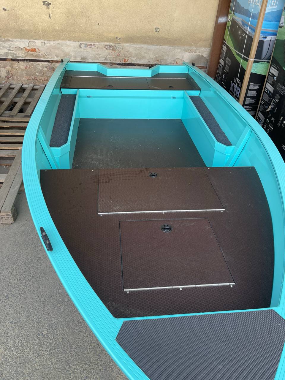 - Удобная компоновка: Лодка оснащена двумя сиденьями с рундуками для хранения снаряжения, а также площадкой для установки датчика эхолота и водотливной помпы.