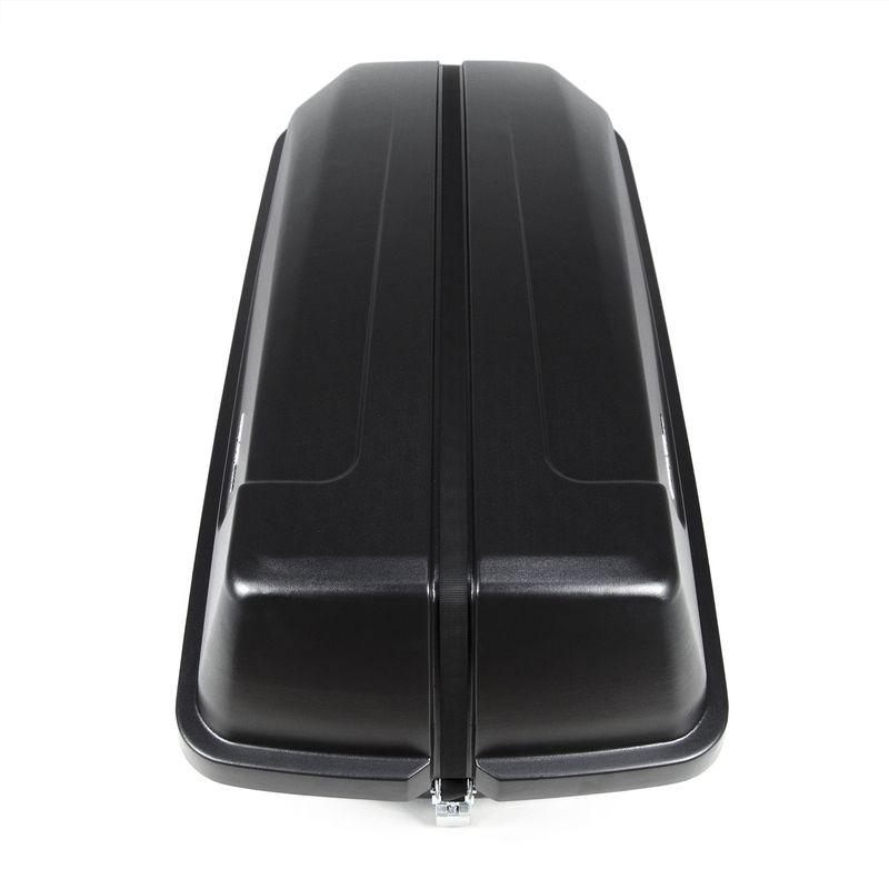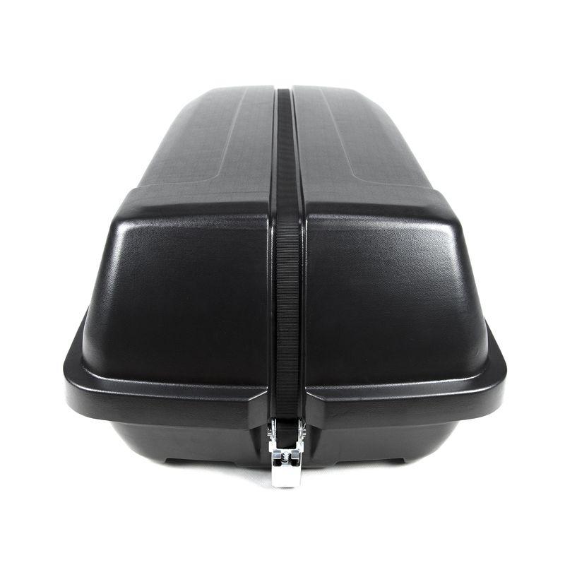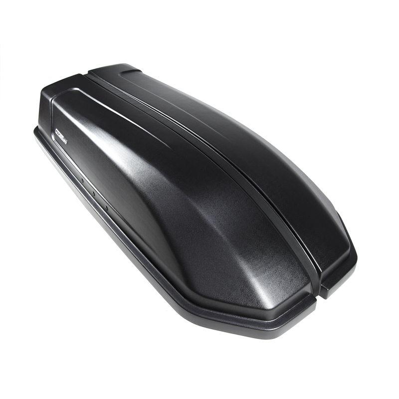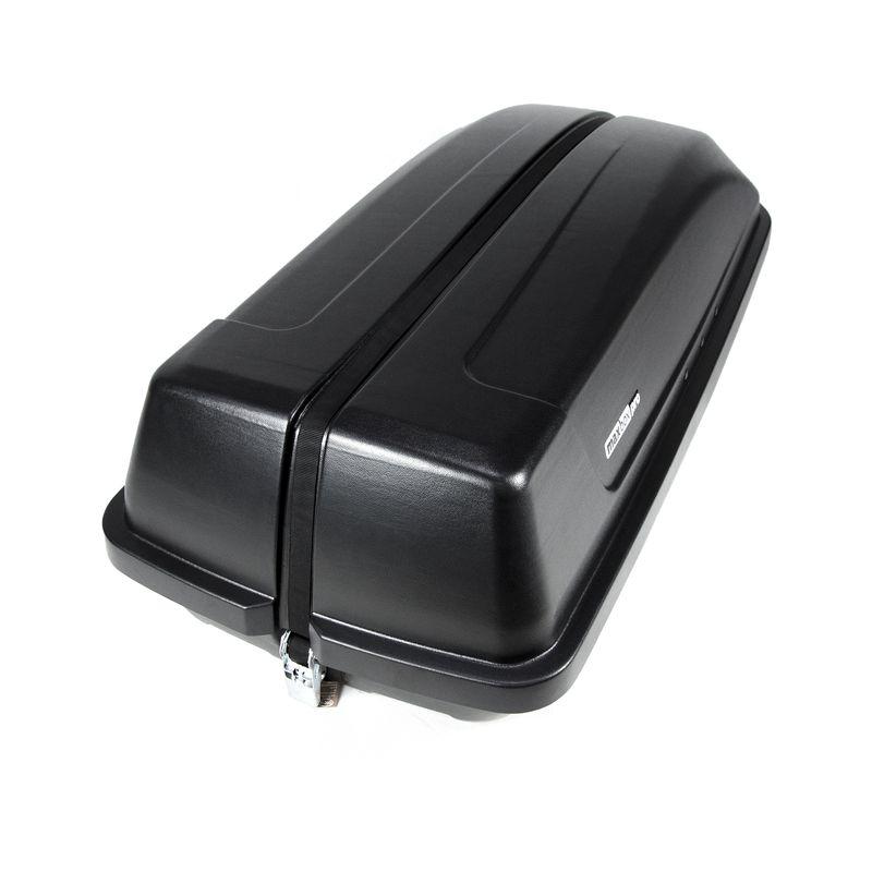 Он отлично подойдет тем, кто хочет значительно расширить ассортимент вещей, перевозимых в авто. Данный автобокс компактного размера (1350x590x370) способен вместить в себя до 50 кг груза объемом 240 литров. Запирание бокса осуществляется с помощью стяжного ремня с храповым механизмом. Крышка бокса полностью откидная, позволяющая сделать легкодоступным весь внутренний объем.