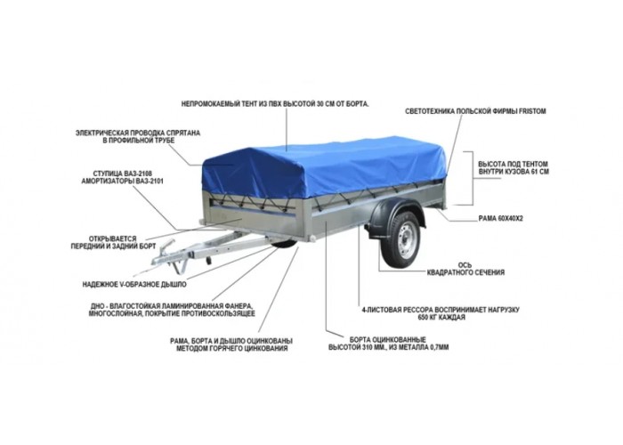 - Рама и подвеска – сварная рама из профиля 60x40 мм с горячим цинкованием, четырехлистовая рессора Alko и амортизаторы ВАЗ 2101 обеспечивают плавность хода.
