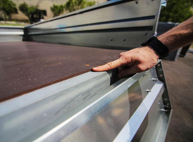 Поверх плита защищена оцинкованным листом металла, толщиной 0,5 мм, что дает великолепную дополнительную защиту как от механических повреждений, так и дополнительно оберегает плиту OSB от негативного воздействия окружающей среды и придает прекрасный вид прицепа.