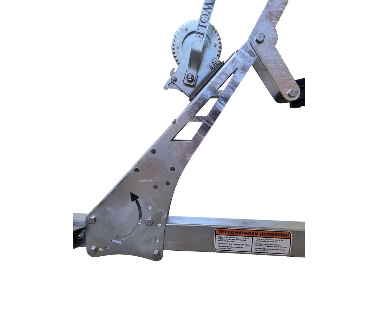 Рама выполнена из оцинкованной стали – долговечная и защищённая от коррозии. Подвеска – рессорно‑амортизационная с пятью листами рессоры, эффективно гасит удары и вибрации на неровных дорогах. Колёса размером 165/70 R13 обеспечивают устойчивость и хорошую управляемость. Сцепное устройство – WOLF B‑70, совместимо с популярными фаркопами. Тормозной системы нет, прицеп лёгкий и простой в обслуживании.