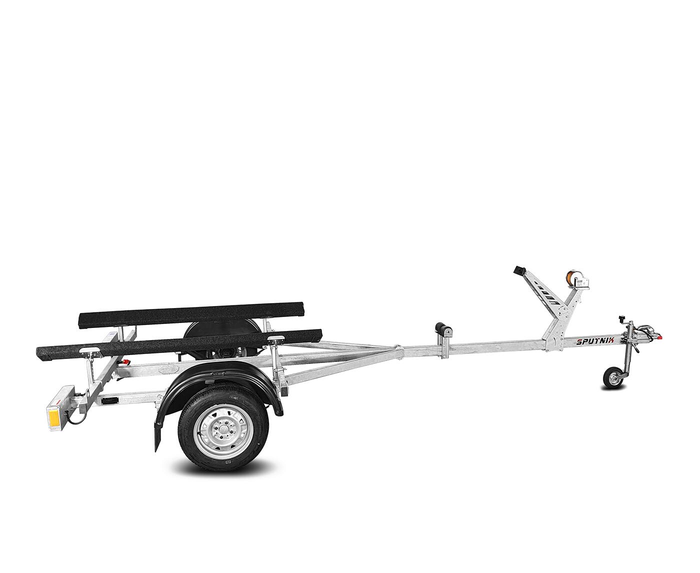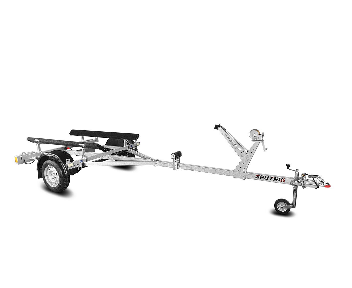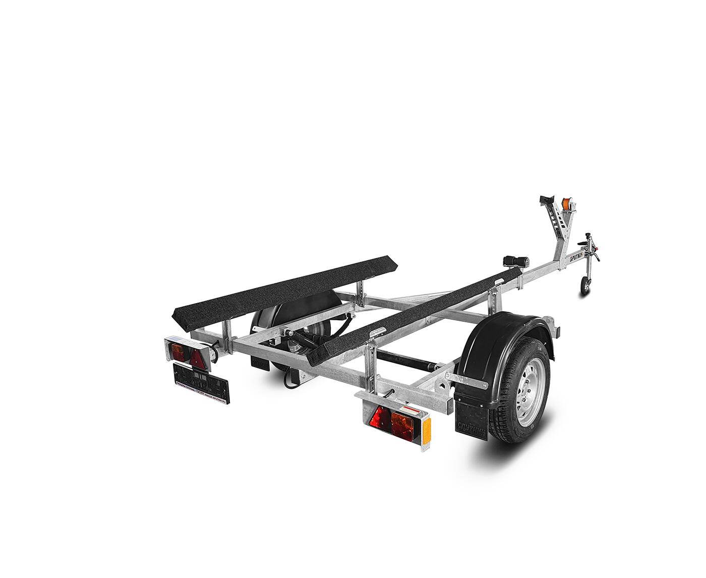Для фиксации лодки на лафете предусмотрены ложементы и крепёжные петли, а ручная лебёдка позволяет легко спускать лодку на воду и поднимать её обратно. Задние съёмные фонари и электропроводка обеспечивают безопасное движение прицепа, особенно в тёмное время.