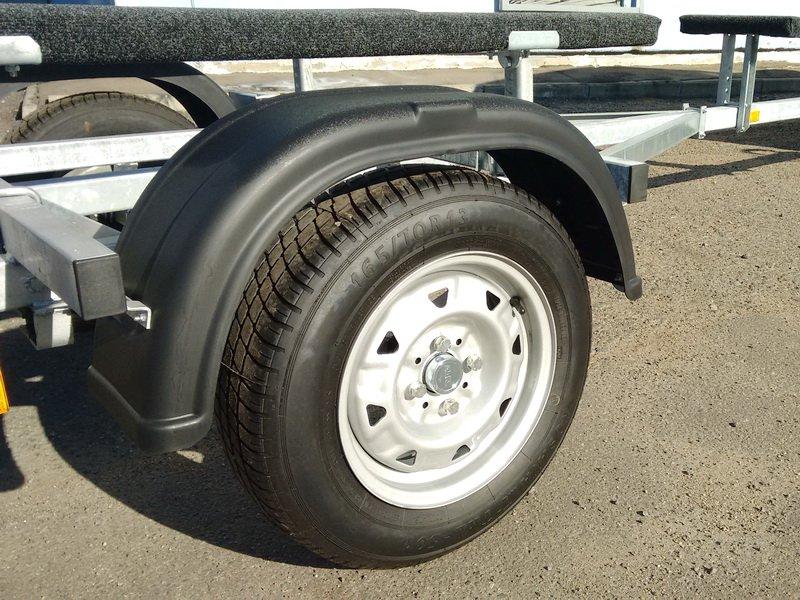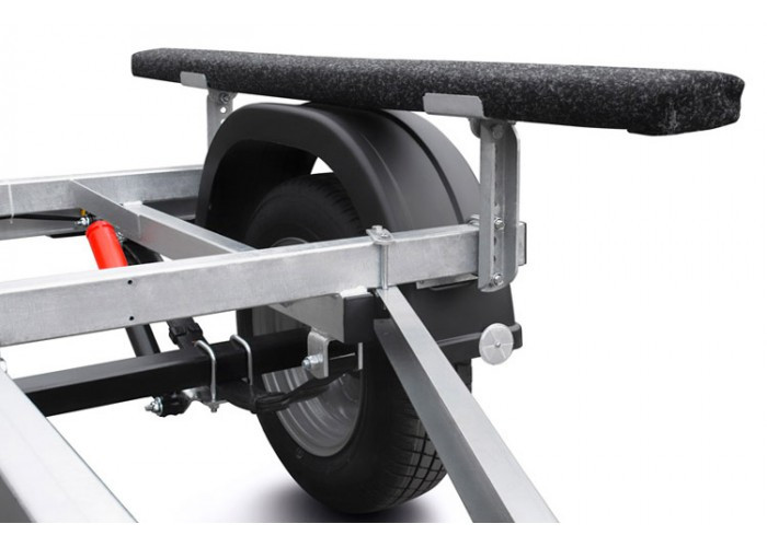 | ● Поперечный ложемент регулируется по высоте и имеет возможность свободного перемещения вдоль дышла прицепа. Это позволяет установить его в оптимальной точке для поддержки днища судна. ● Рессорная подвеска (2 рессоры по 3 листа) с гидравлическими амортизаторами сохраняет стабильную плавность хода при разной загруженности прицепа. | |