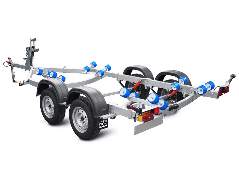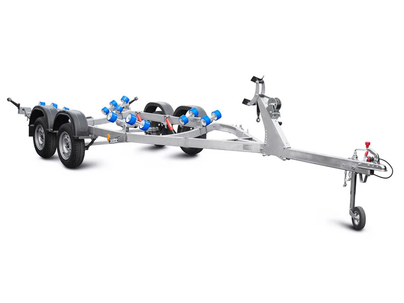 - Роликовые опоры обеспечивают удобный спуск судна на воду и его подъём на сложных, необорудованных участках берега, где нет возможности заезда прицепа на достаточную глубину. Четыре роликовых модуля, с четырьмя роликами на каждом, могут быть установлены в любой точке поперечины рамы, их оцинкованный кронштейн имеет саморегулируемый угол наклона, а каждая пара роликов самостоятельно подстраивается под обводы судна. Такая конструкция облегчает центрирование и обеспечивает удобную поддержку судна и при его загрузке и выгрузке под большим углом. Вспомогательный килевой ролик на задней поперечине обеспечивает свободное скольжение киля при подъёме судна на прицеп.