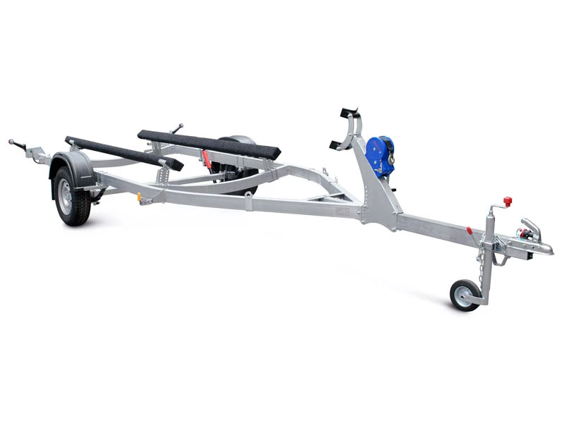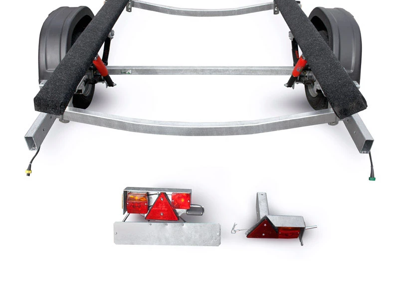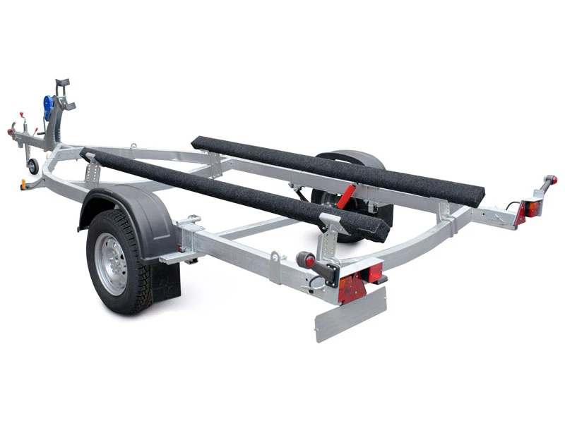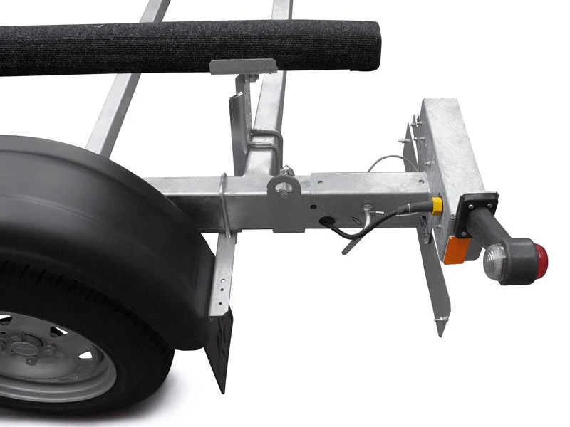 - Усиленная оцинкованная стальная рама выполнена из замкнутого профиля, имеет большой запас прочности и позволяет уберечь жгут электропроводки от внешних повреждений по все длине прицепа. Изогнутая конструкция поперечин рамы обеспечивает максимально низкую посадку судна, что снижает центр тяжести и повышает устойчивость прицепа во время движения.