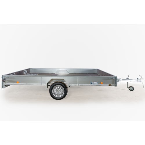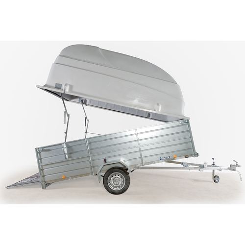 Техническая характеристика: Прицеп одноосный, без тормозов, снабжен кузовом, предусматривающим установку салазок для перевозки водных мотоциклов. Передний и задний борта съемные. Кузов опрокидывается (откидной, самосвального типа). Высота бортов - 240 мм.Борта и крылья изоцинкованной стали. Днище - ламинированная фанера. На прицепе установлена зависимая подвеска колес на двух полуэллиптических рессорах с гидравлическими амортизаторами. Каркас с тентом - дополнительная комплектация. Каркас выполнен из металлического профиля. Стандартная комплектация: автоприцеп, регулятор сцепного устройства, кронштейн для запаски, ПТС. Опорное колесо.