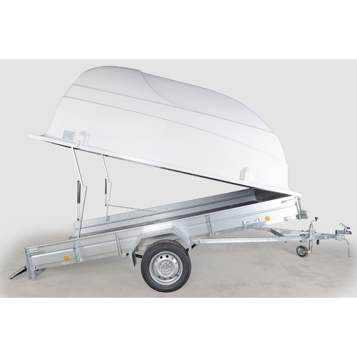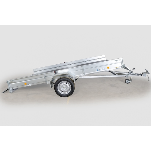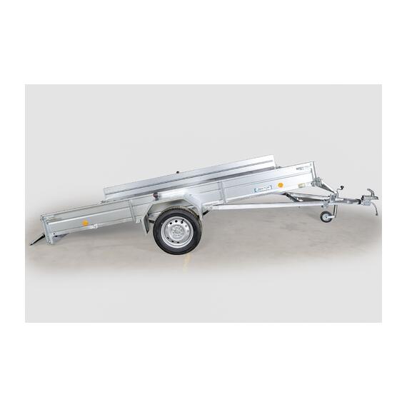 Техническая характеристика: Прицеп одноосный, без тормозов, снабжен кузовом, предусматривающим установку салазок для перевозки водных мотоциклов. Передний и задний борта съемные. Кузов опрокидывается (откидной, самосвального типа). Высота бортов - 380-400 мм.Борта и крылья из оцинкованной стали. Днище - ламинированная фанера. На прицепе установлена зависимая подвеска колес на двух полуэллиптических рессорах с гидравлическими амортизаторами. Каркас с тентом - дополнительная комплектация. Каркас выполнен из металлического профиля. Стандартная комплектация: автоприцеп, регулятор сцепного устройства, кронштейн для запаски, ПТС. Опорное колесо- дополнительная комплектация.
