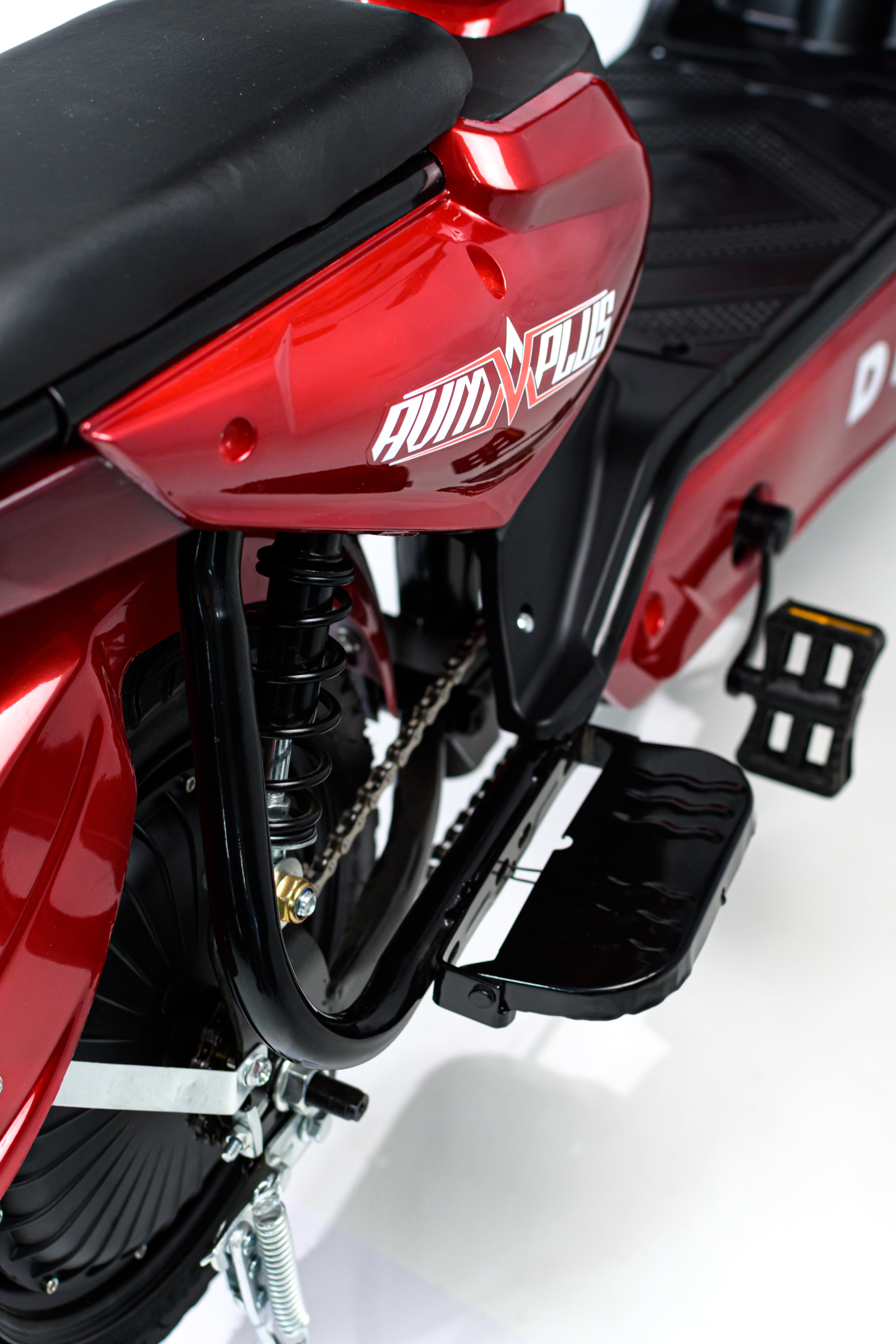 - Электроскутер оснащен барабанными тормозами, обеспечивающими надежное и безопасное торможение