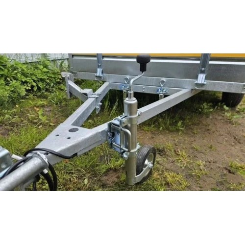 Усиленный поворотный хомут обеспечивает надежную фиксацию опорного колеса или стойки и повышает удобство использования прицепа в транспортном и рабочем режимах.