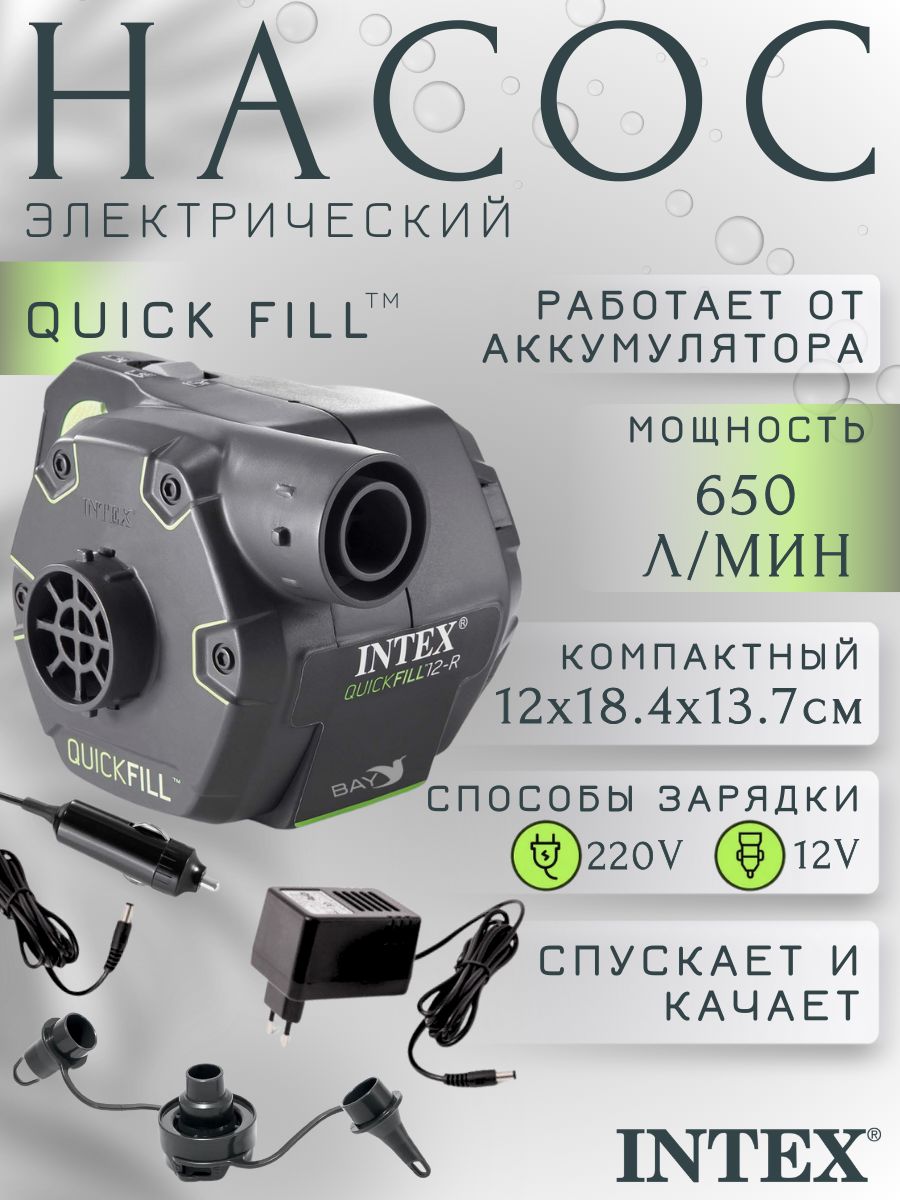 За считанные минуты при помощи насоса аккумуляторного Intex Quick Fill 66642 Вы получаете из свертка полноценную кровать, матрас, лодку, надувной бассейн или детский игровой центр. Заряжается от сети 220В (в течение 9-10 часов) или от бортовой сети автомобиля 12В (в течение часа). Причем Вы не прикладываете при этом никаких усилий. Электрический насос Intex Quick Fill 66642 предназначен для быстрого накачивания и скачивания надувных изделий фирм-производителей Intex, Bestway и др.