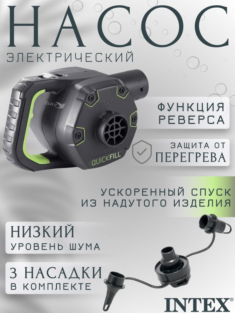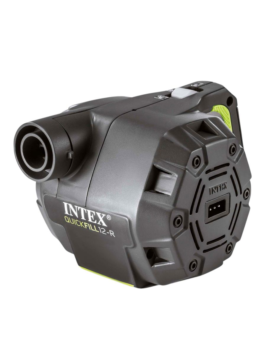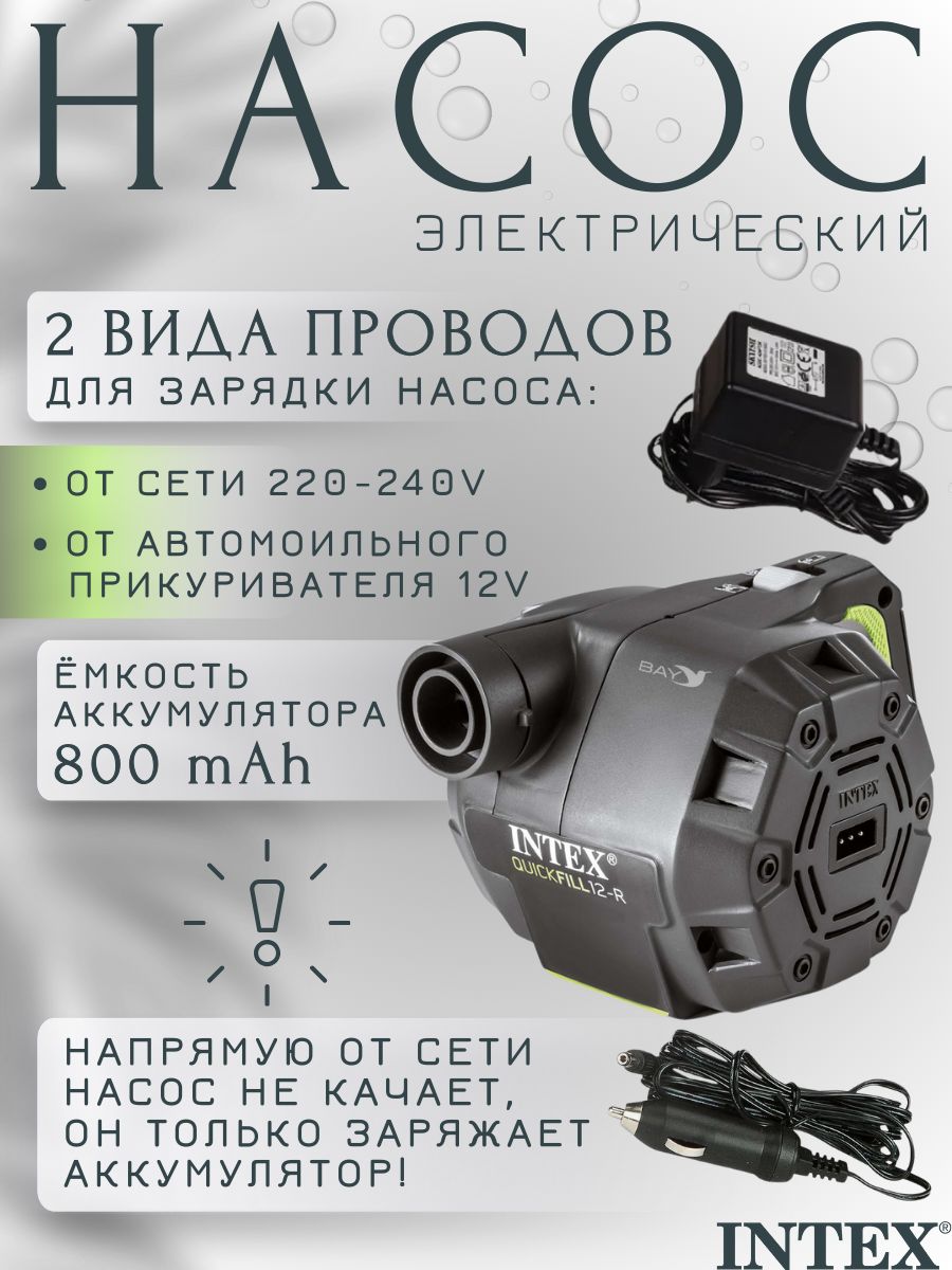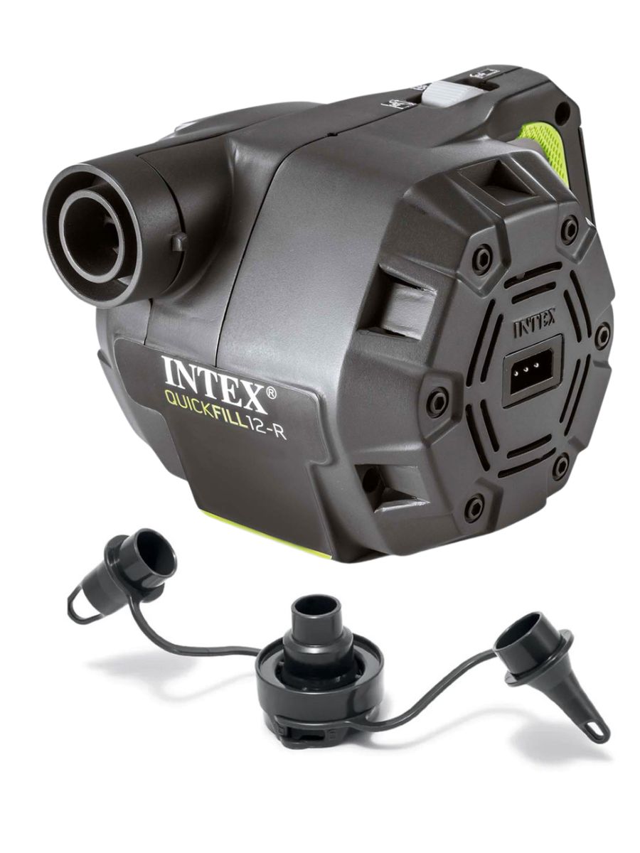 Электрический аккумуляторный насос Intex Quick Fill 66642 имеет два отверстия — одно для накачивания, другое — для спуска. В комплект насоса входит набор переходников, блок питания (адаптер) на 220 В и шнур для запитывания насоса от прикуривателя.