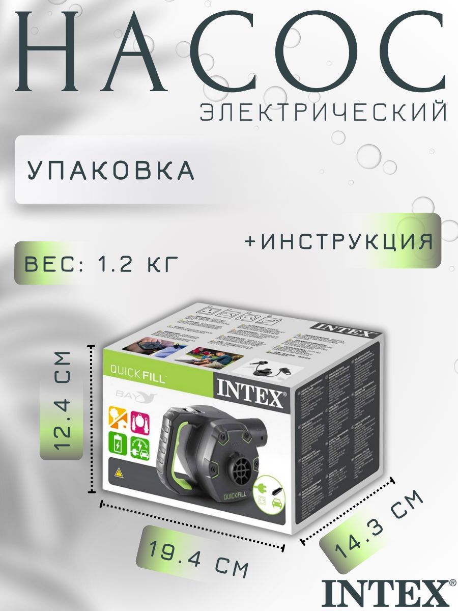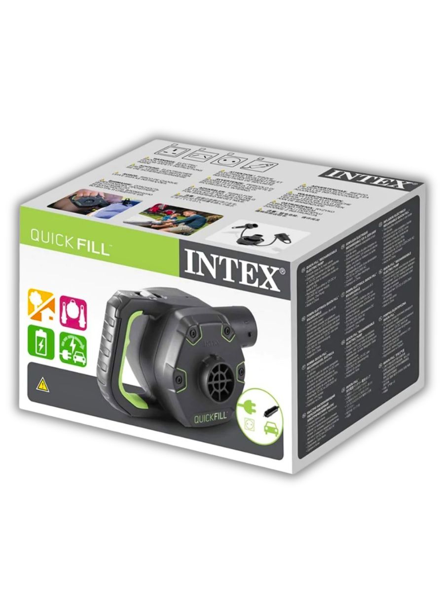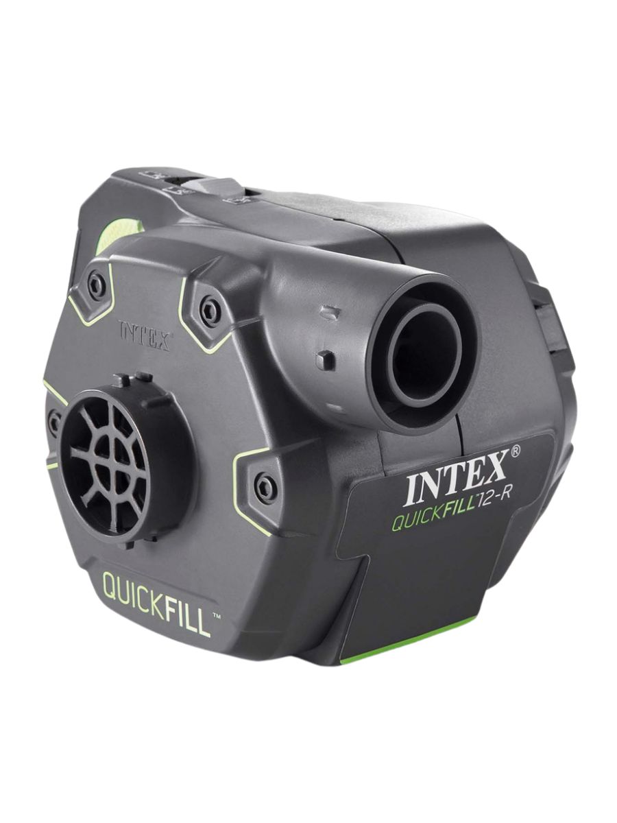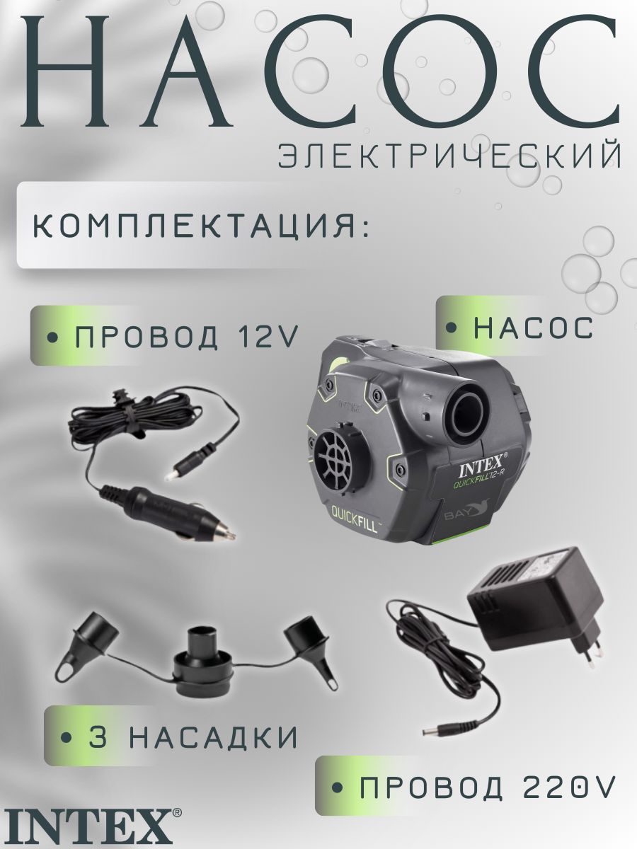 Электрический аккумуляторный насос Intex Quick Fill 66642 имеет два отверстия — одно для накачивания, другое — для спуска. В комплект насоса входит набор переходников, блок питания (адаптер) на 220 В и шнур для запитывания насоса от прикуривателя.