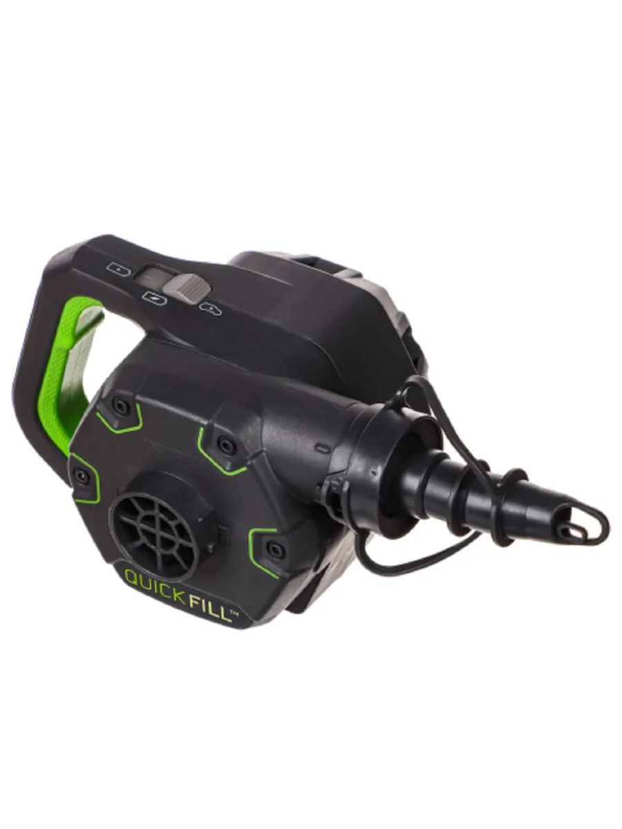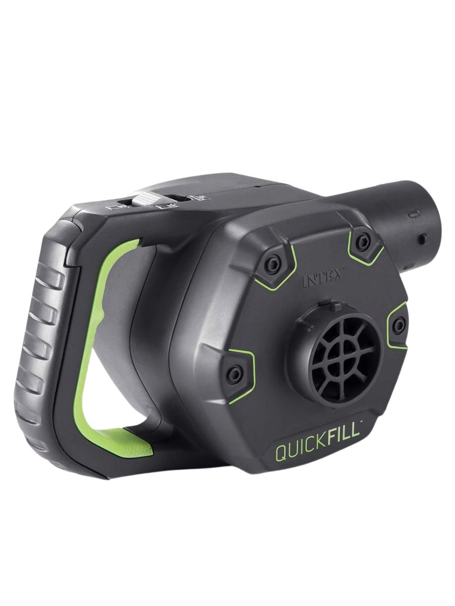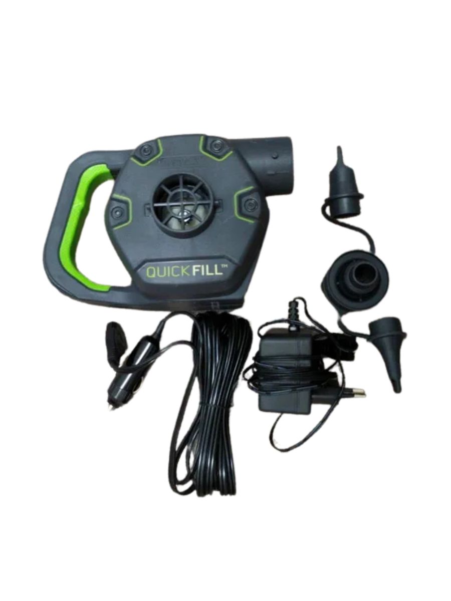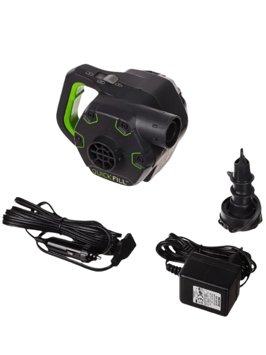 Электрический аккумуляторный насос Intex Quick Fill 66642 имеет два отверстия — одно для накачивания, другое — для спуска. В комплект насоса входит набор переходников, блок питания (адаптер) на 220 В и шнур для запитывания насоса от прикуривателя.