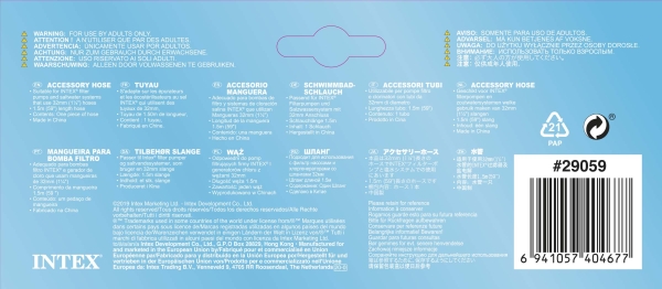 Гофрированный шланг Intex 29059 - легкий и гибкий шланг с диаметром 32мм предназначен для подключения к бассейну фильтрующих насосов Intex 28602, 28604 и 28638(638R), а также аксессуаров для очистки бассейна и прочих устройств