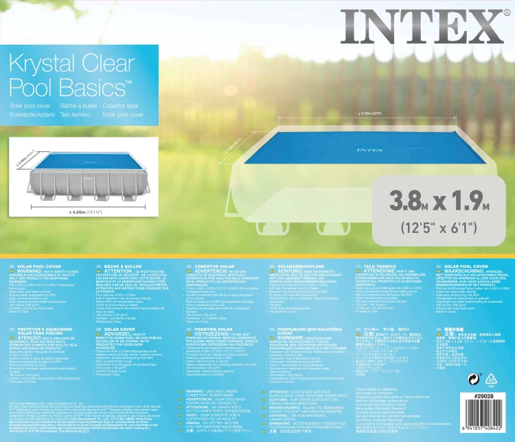 Тент обогревающий для прямоугольных бассейнов Intex: 378х186 см. В солнечные дни тент использует солнечную энергию для нагрева воды. Крышка должна свободно плавать на поверхности воды, диаметр крышки намеренно меньше диаметра бассейна.
