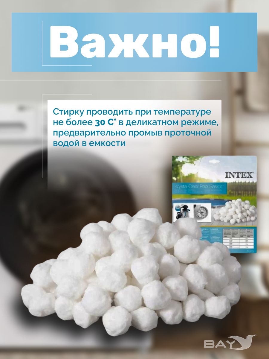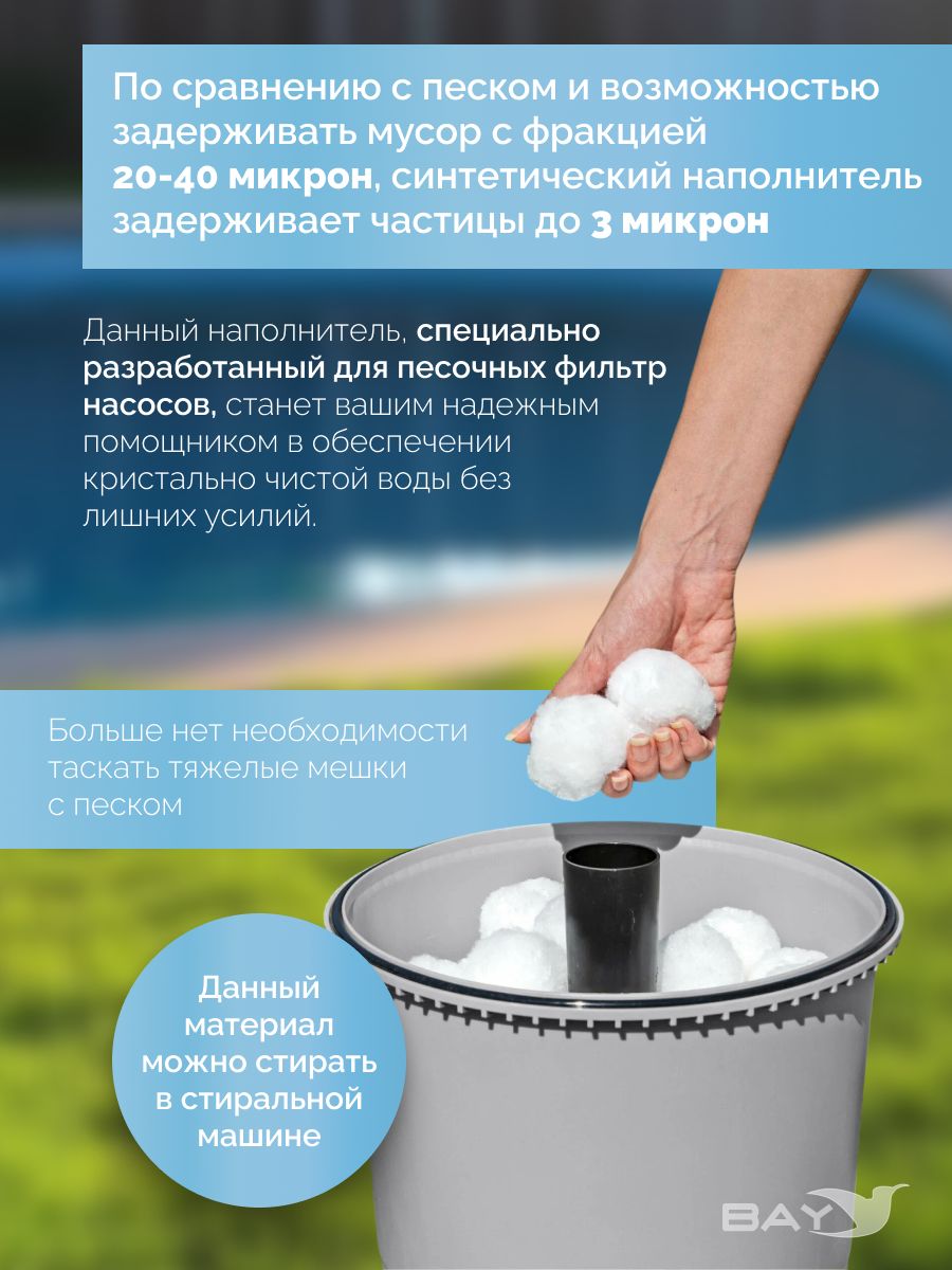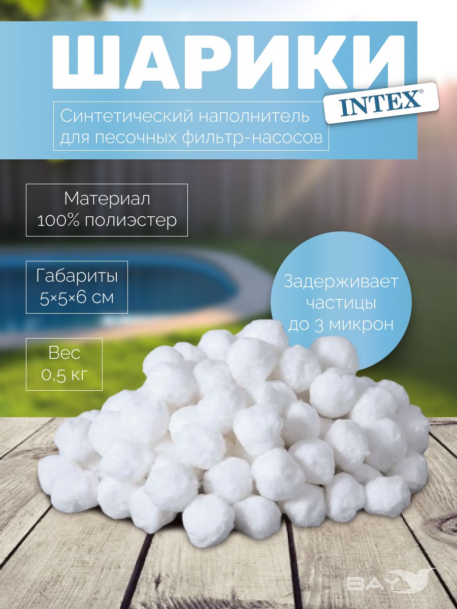 Фирменный наполнитель Fiber Ball 29045 специально разработан для песочных фильтр-насосов Intex. Он хорошо чистит воду в бассейне, долго служит и абсолютно безопасен для окружающей среды. Главное его преимущество - небольшой вес и экономичность. Всего 500 грамм наполнителя заменяет 18 кг кварцевого песка. Теперь не нужно покупать тяжеленные мешки, возить их и таскать.