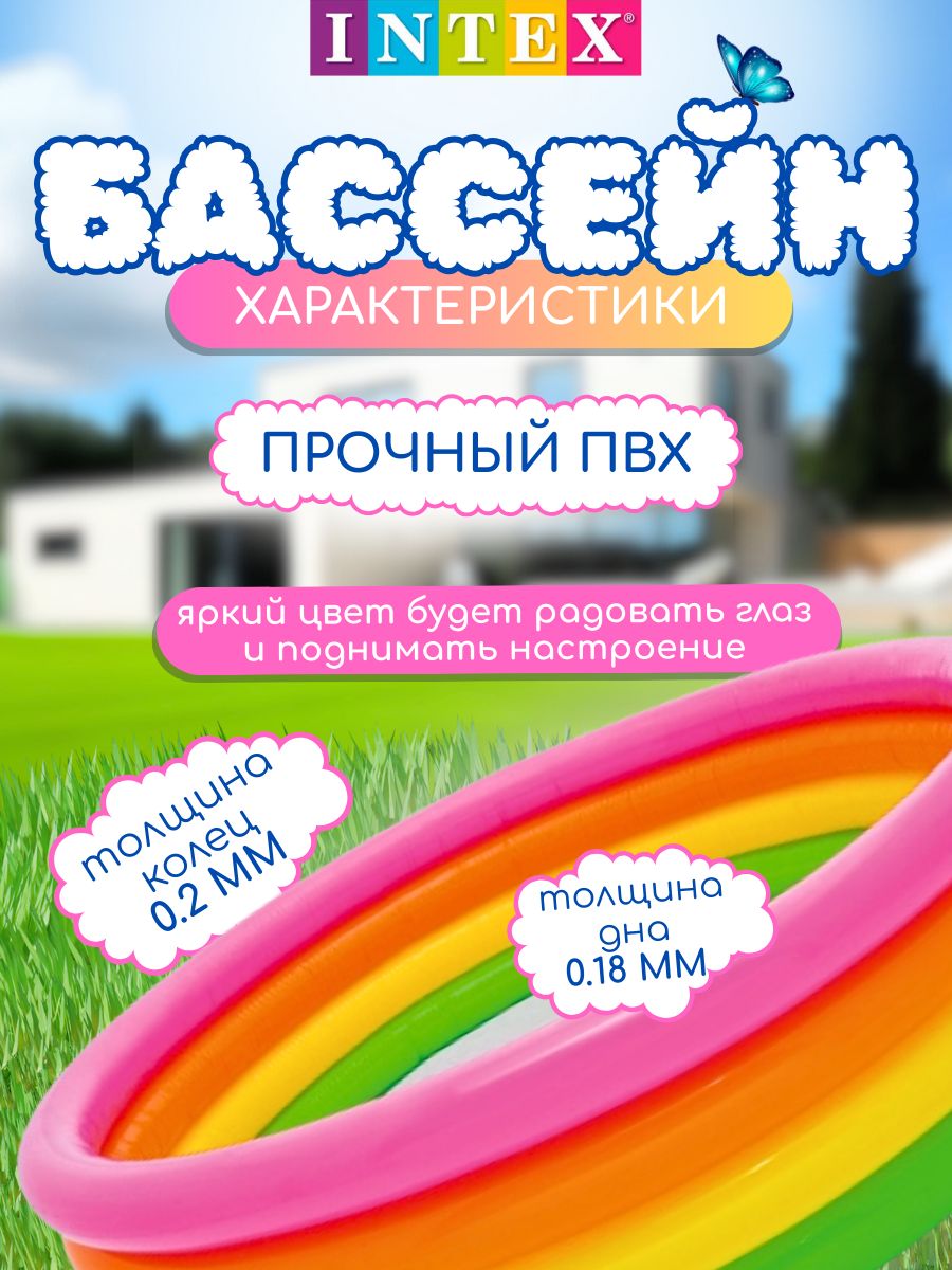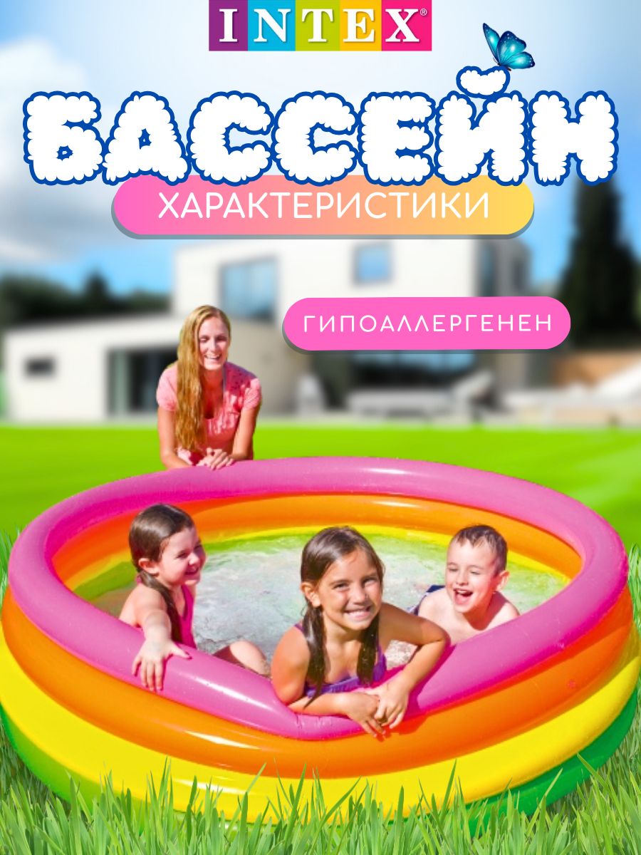 Надувной бассейн Intex "Радуга" модели 56441 создан специально для безопасного купания и игр детей от 3 лет. Яркий дизайн и удобная конструкция делают этот бассейн идеальным выбором для летнего отдыха на даче или во дворе частного дома.