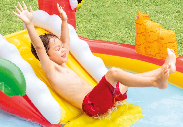 Игровой центр «Веселый Дино» с горкой и спреем. Заберитесь в пасть динозавра и скатитесь с холма в бассейн.Игровой центр «Веселый Дино» - это настоящая вечеринка в саду с горкой, брызгами воды и игрой в метание колец. Когда садовый шланг подключен к игровому центру, распылитель воды распыляется рядом с горкой. В нижней части горки находится мягкий коврик, который обеспечивает большую безопасность.Игровой бассейн может быть заполнен до 12 см и 150 литров воды. Бассейн оборудован сливной пробкой. Материал имеет винил толщиной 0,30 мм, устойчив к детским играм. При обнаружении утечки ее можно легко и быстро устранить с помощью ремонтного комплекта, включенного в комплект.