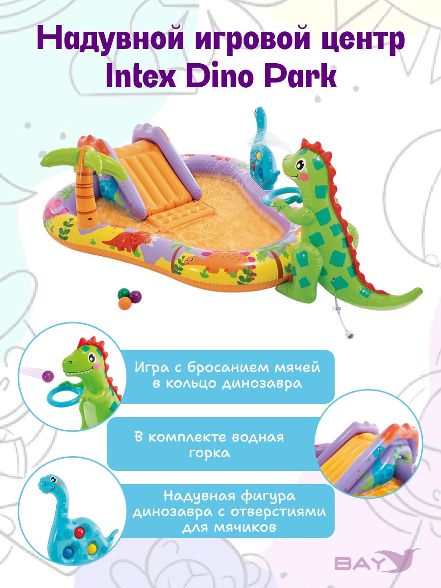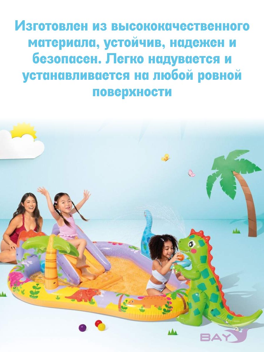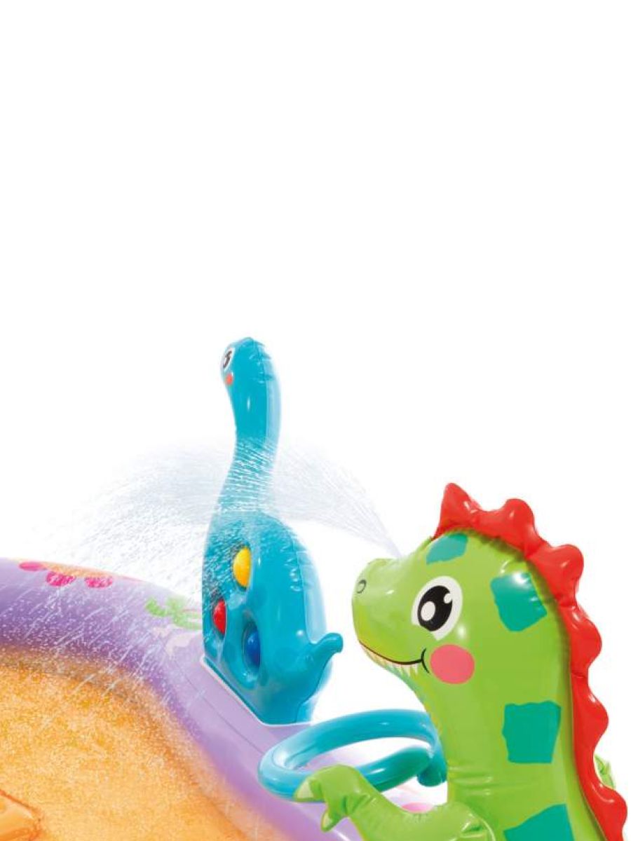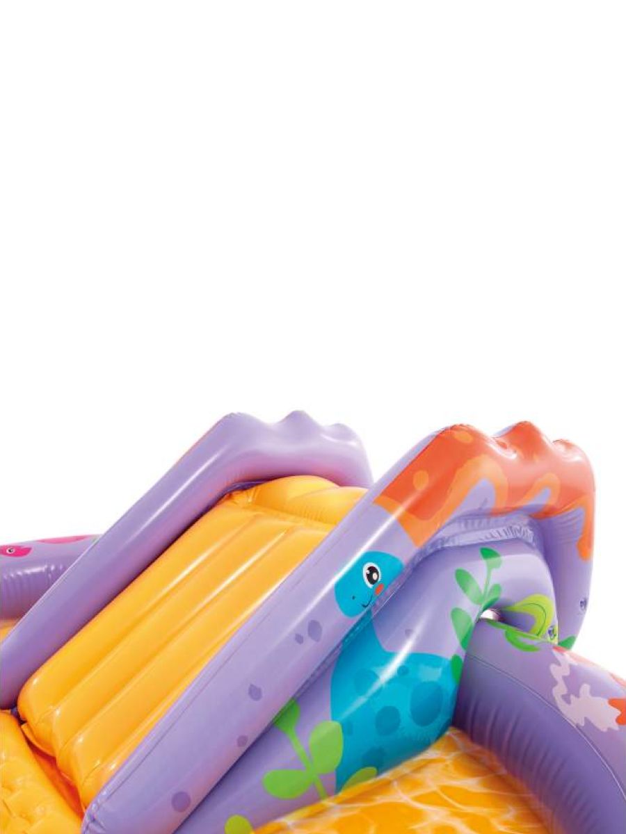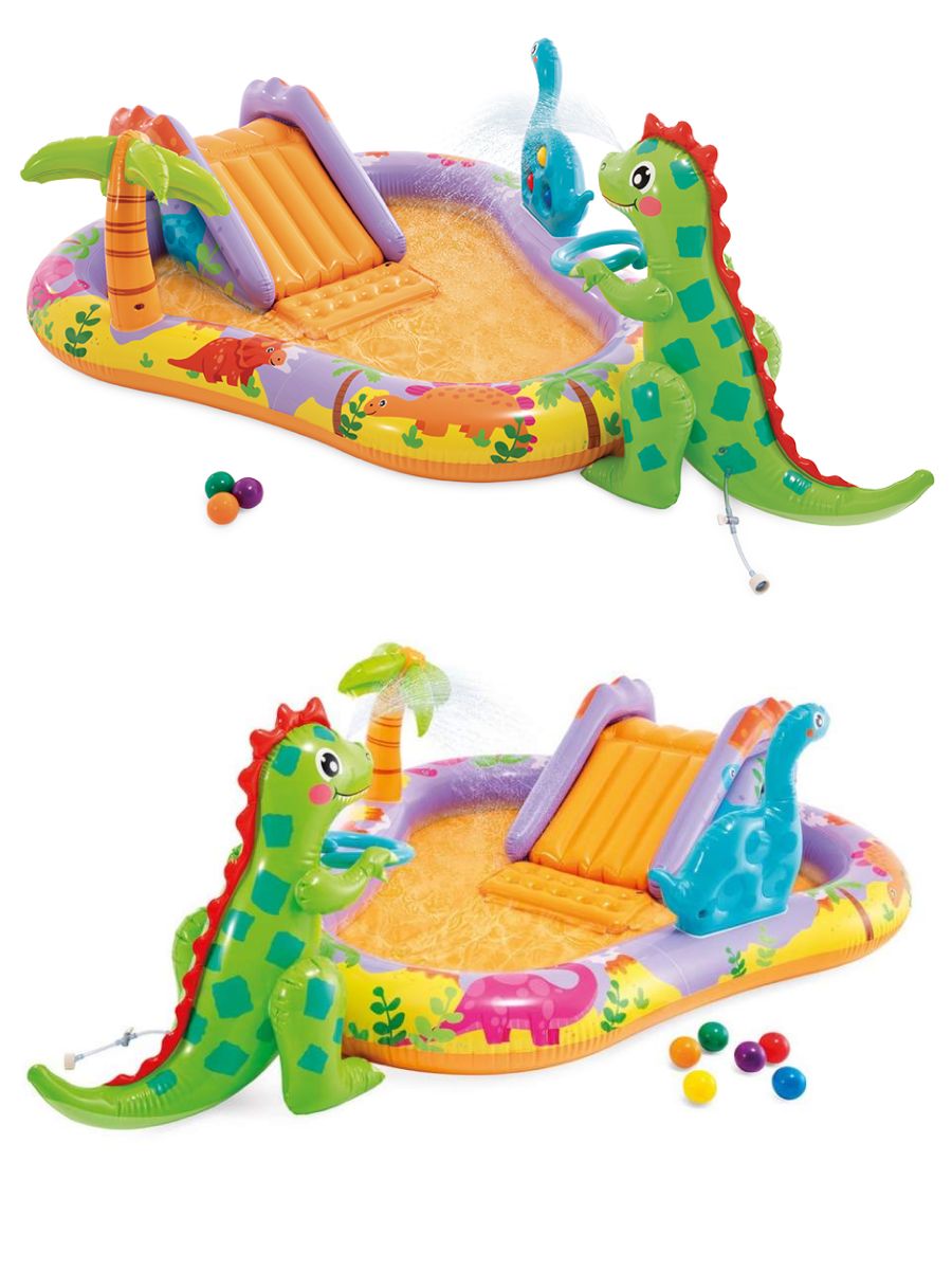 Включает в себя: горку, по которой можно скатываться в мини-бассейн, фонтанчик-душ-динозаврик, подсоединяющийся к садовому шлангу, мягкие надувные мячики и кольца.
