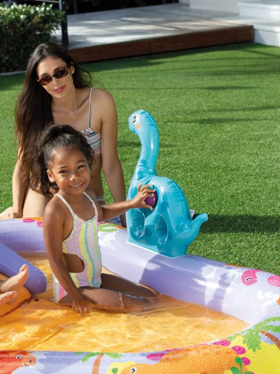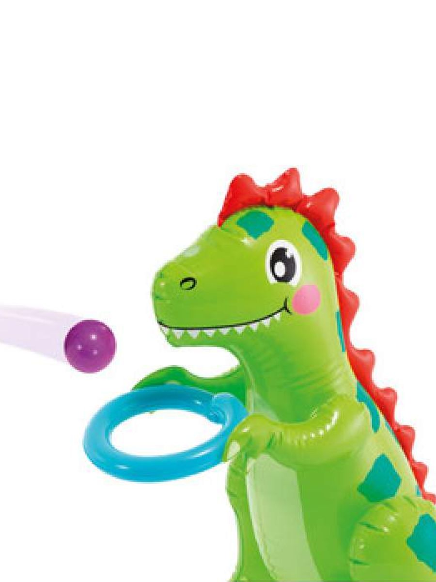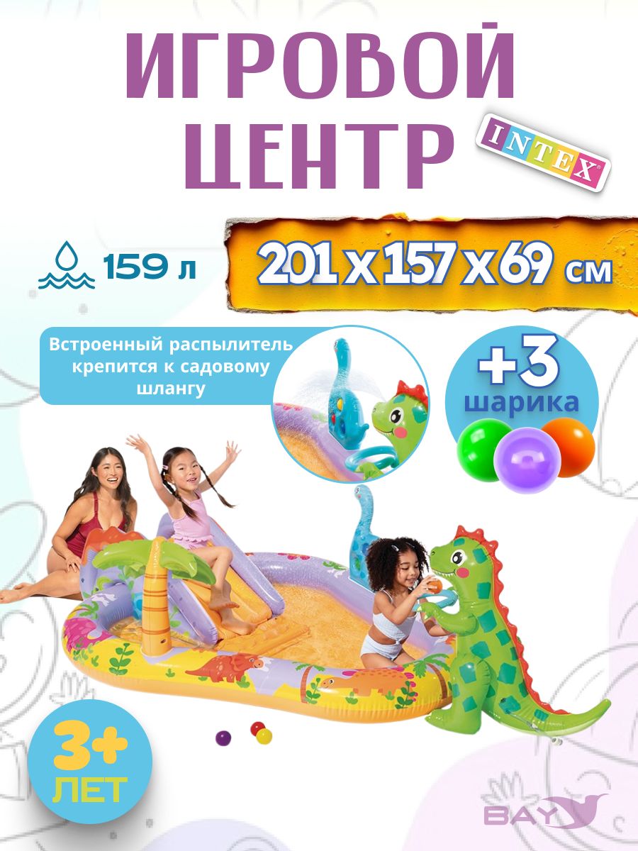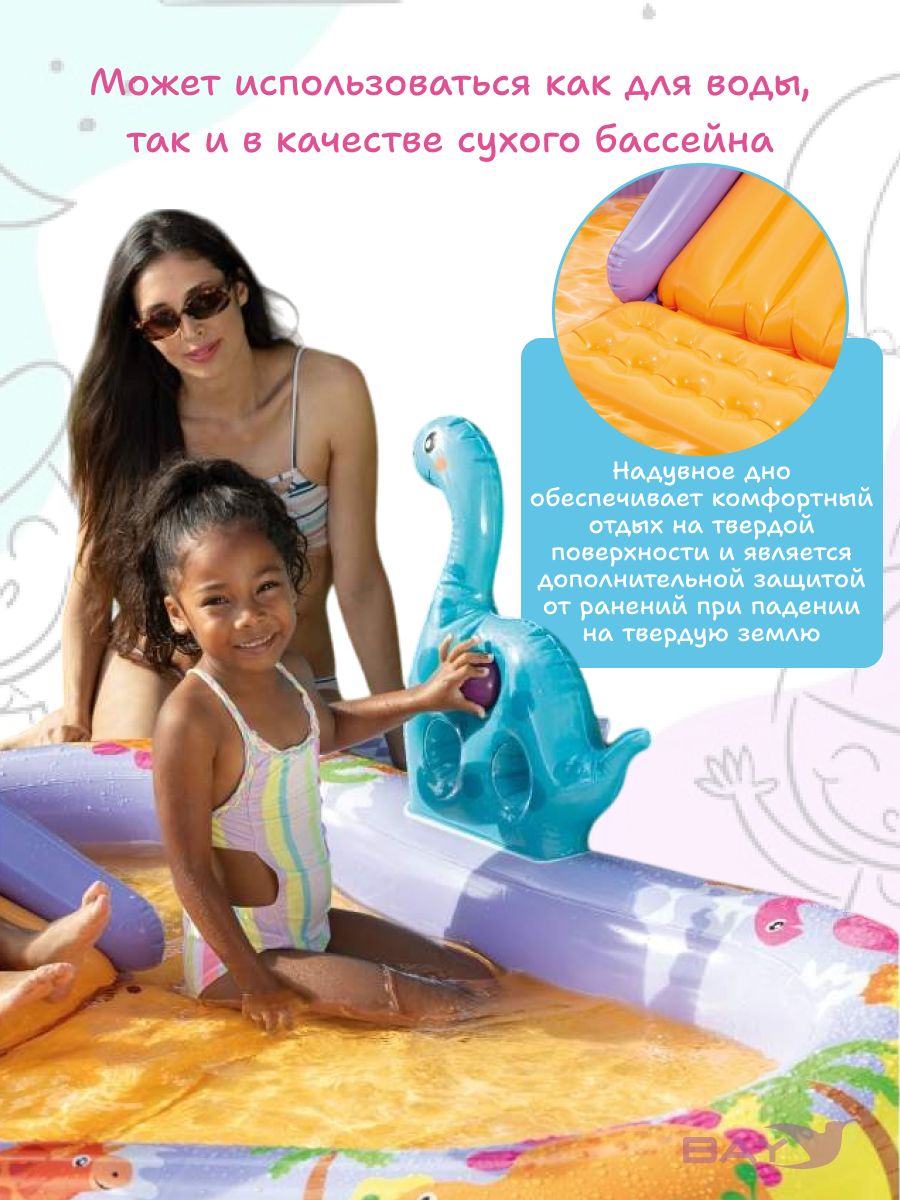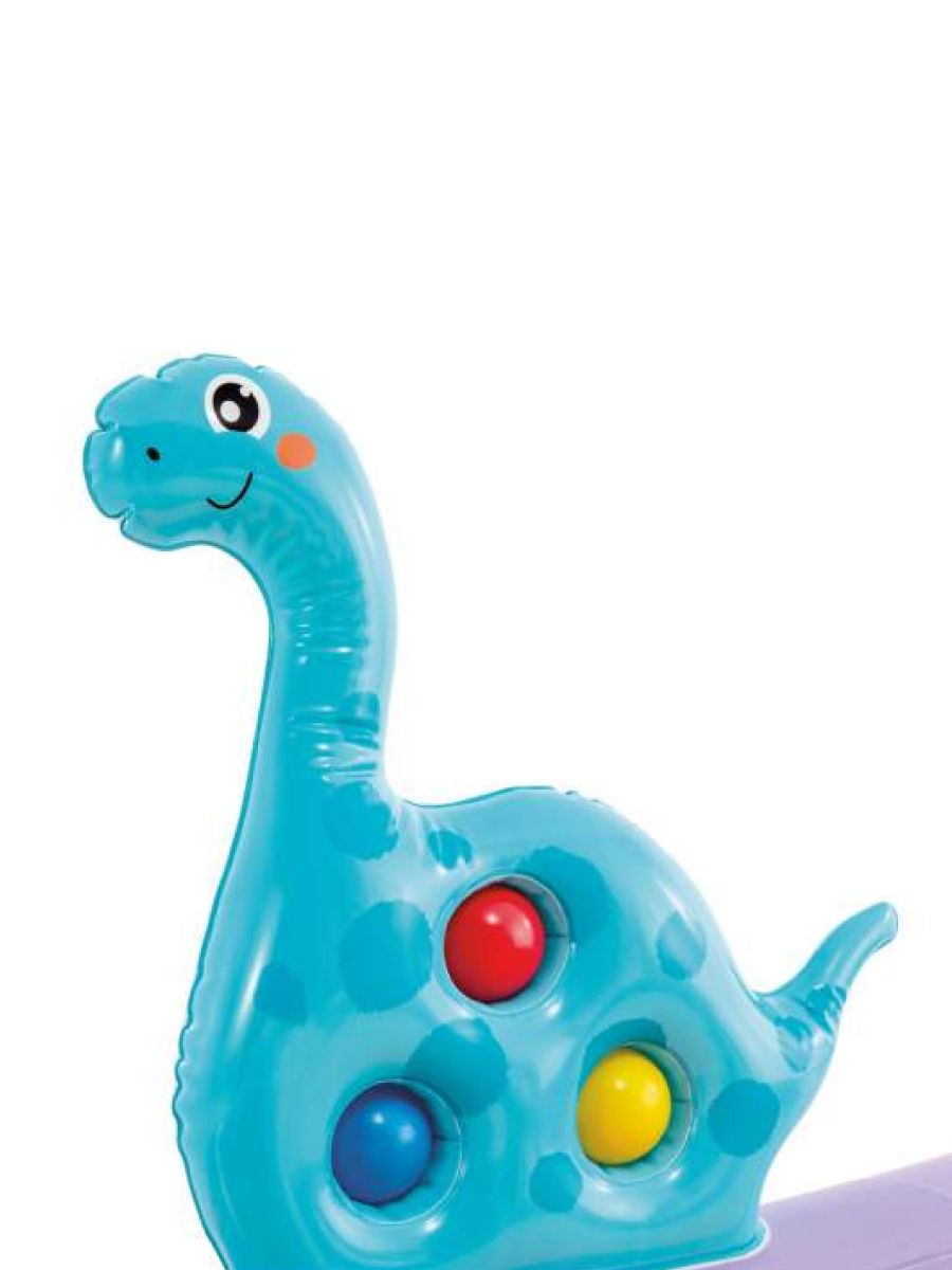 Включает в себя: горку, по которой можно скатываться в мини-бассейн, фонтанчик-душ-динозаврик, подсоединяющийся к садовому шлангу, мягкие надувные мячики и кольца.