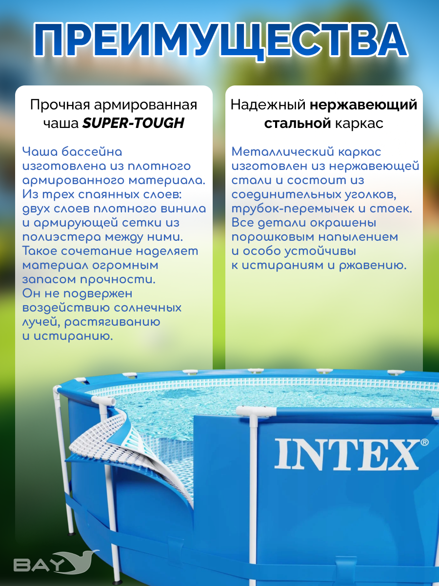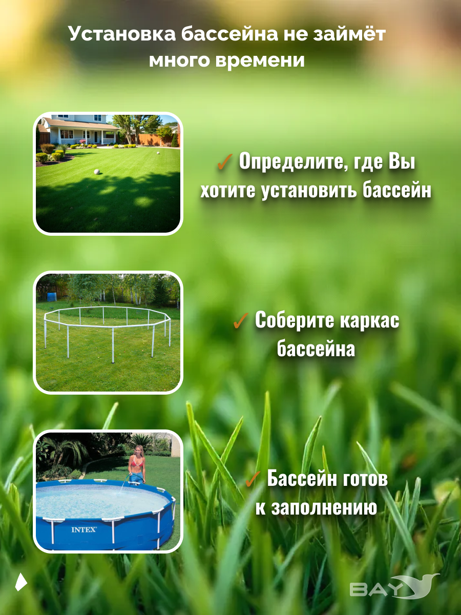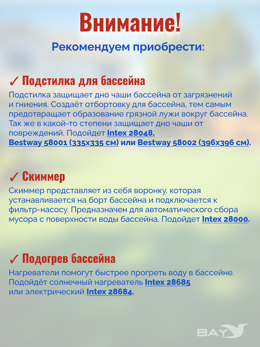 ✓ Защитный тент. Тент для защиты от листьев, насекомых и прочего мусора. А так же защитит от ультрафиолетовых лучей, которые ускоряют процесс цветения воды. Подойдёт Intex 28030.