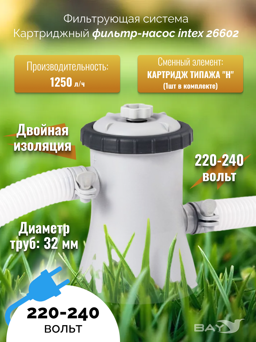 Картриджный фильтр-насос Intex 26602. Производительность: 1250 л/час 220-240 Вольт Двойная изоляция Сменный элемент: картридж типа "H" (1шт в комплекте) Длина сетевого шнура: 190 см